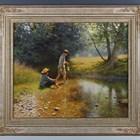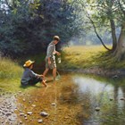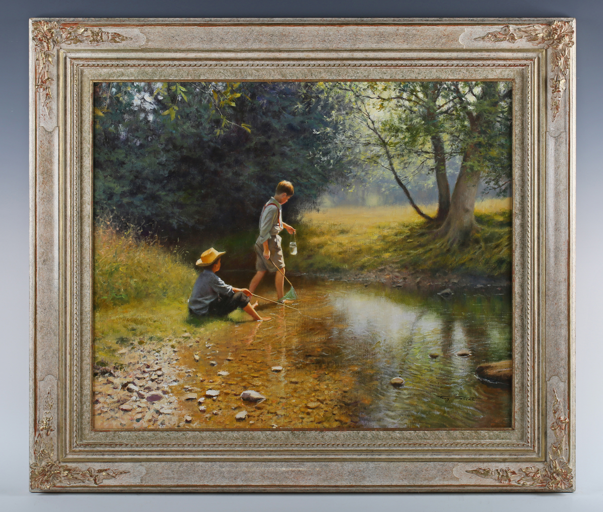 Tony Sheath (British b.1946) - Two boys fishing in the shallows, oil on canvas, signed lower right, 50.5cm x 61.5cm, within a painted composition frame. Provenance: Stacy-Marks.