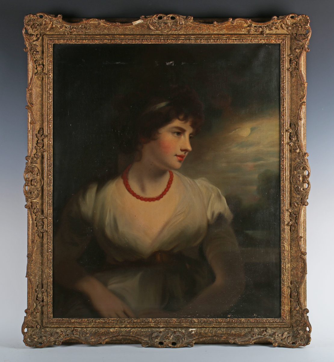 After John Hoppner (British 1758-1810) - Half-length portrait of Jane Elizabeth Harley, Countess of Oxford (née Scott), oil on canvas, 76cm x 63cm, within a swept gilt composition frame.