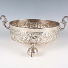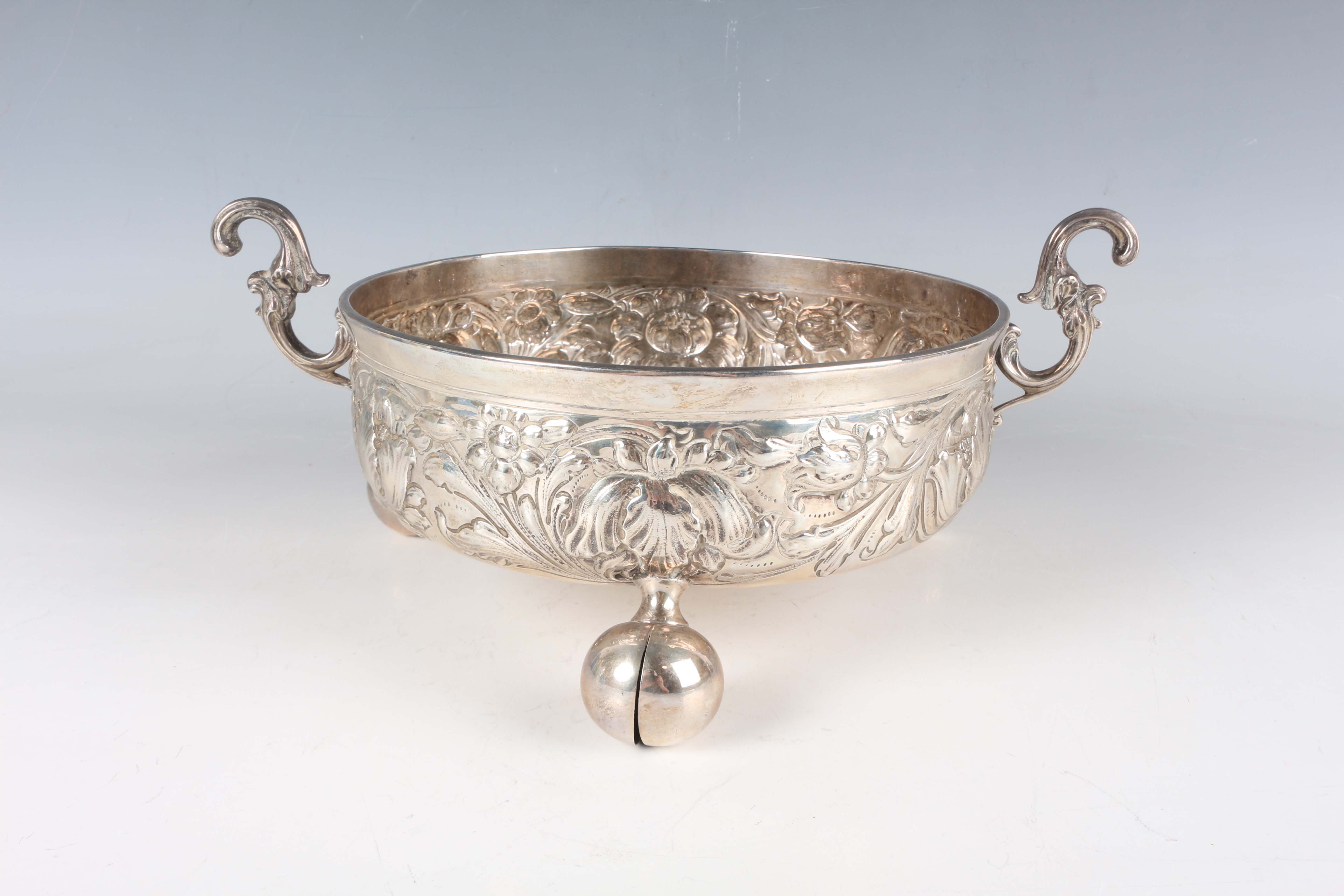 An Edwardian silver circular two-handled bowl, the shallow body decorated in relief with stylized flowers, flanked by cast scroll handles, raised on three ball feet, London 1908 by Lambert & Co, weight 661.2g, length 26cm, height 11.5cm (one foot split).