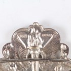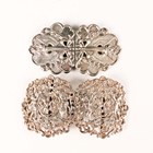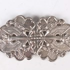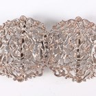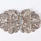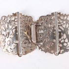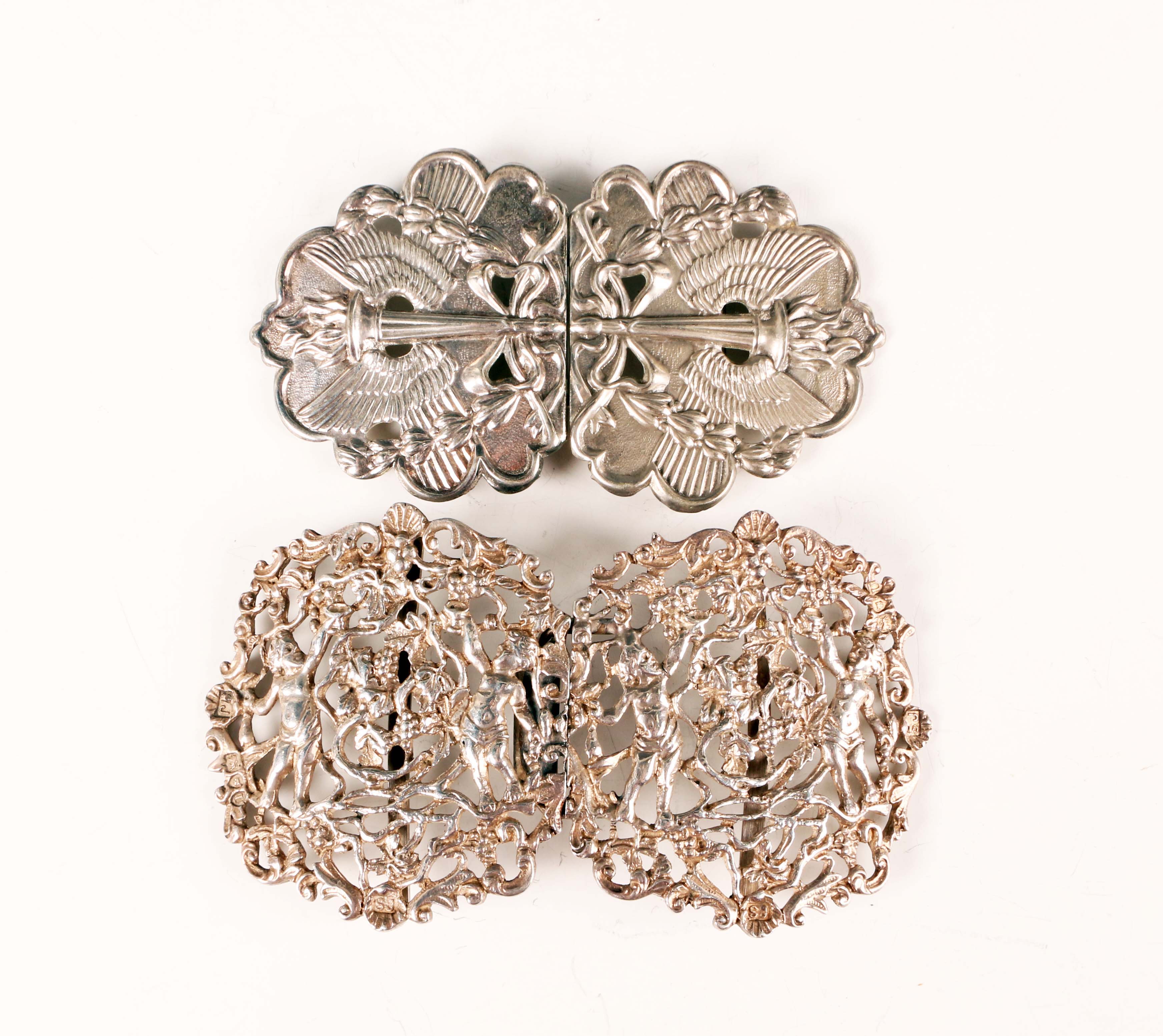 A late Victorian silver two-piece waistbelt buckle, cast and pierced with putti harvesting grapes, London 1895 by Samuel Jacob, total length 11cm, and an Elizabeth II silver two-piece waistbelt buckle, cast and pierced with flaming torches and bellflower garlands, Sheffield 1977 by MT, total length 10cm, total weight 132.4g.