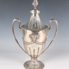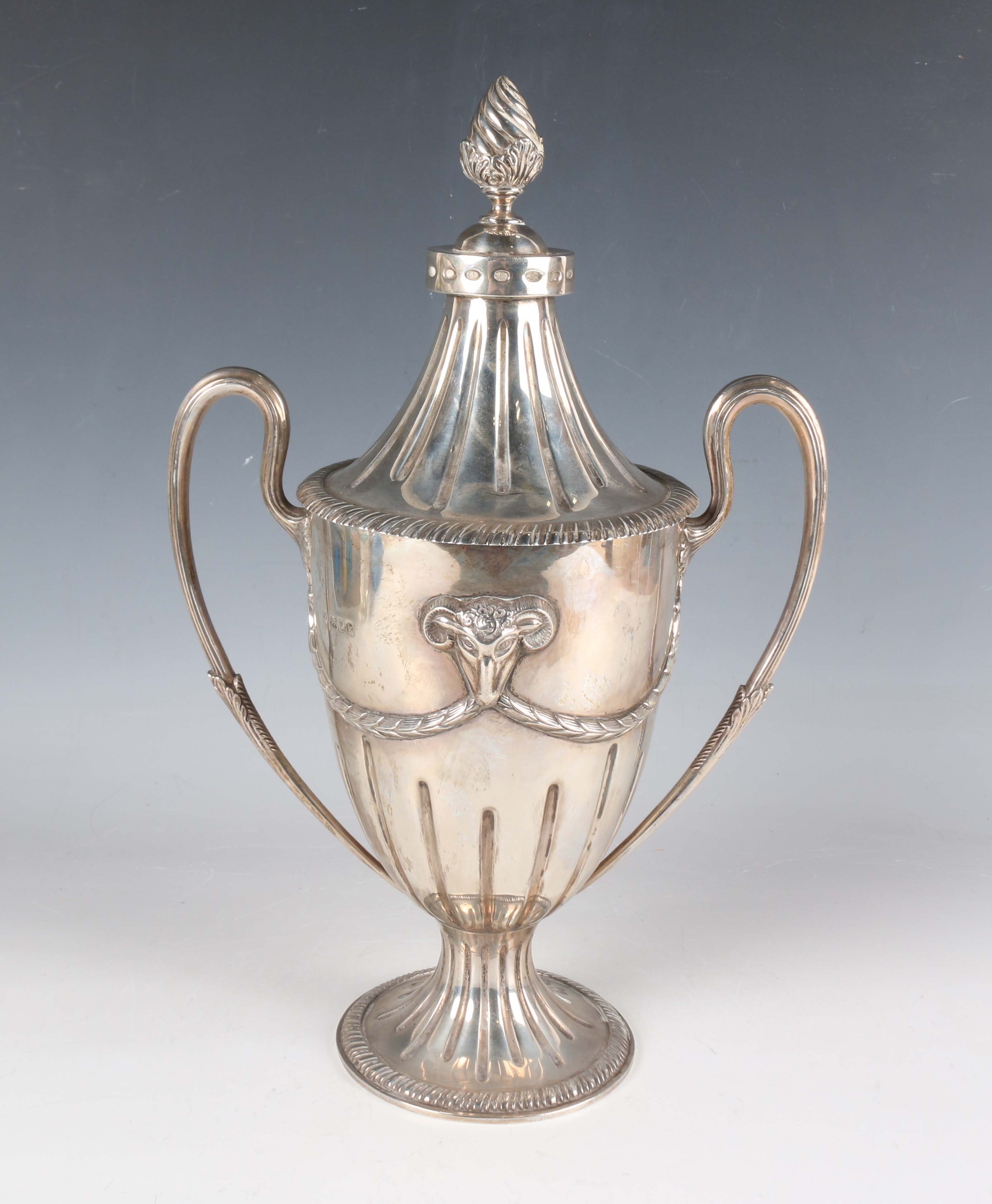 An Edwardian silver two-handled cup and tapering circular cover with spiral bud finial above a gadrooned rim, the 'U' shaped body cast with opposing rams' masks and foliate garlands, flanked by raised reeded and foliate handles, on a similarly decorated circular foot, London 1905 by Peter Henderson Deere, weight 1455.8g, height 36cm.