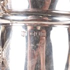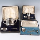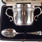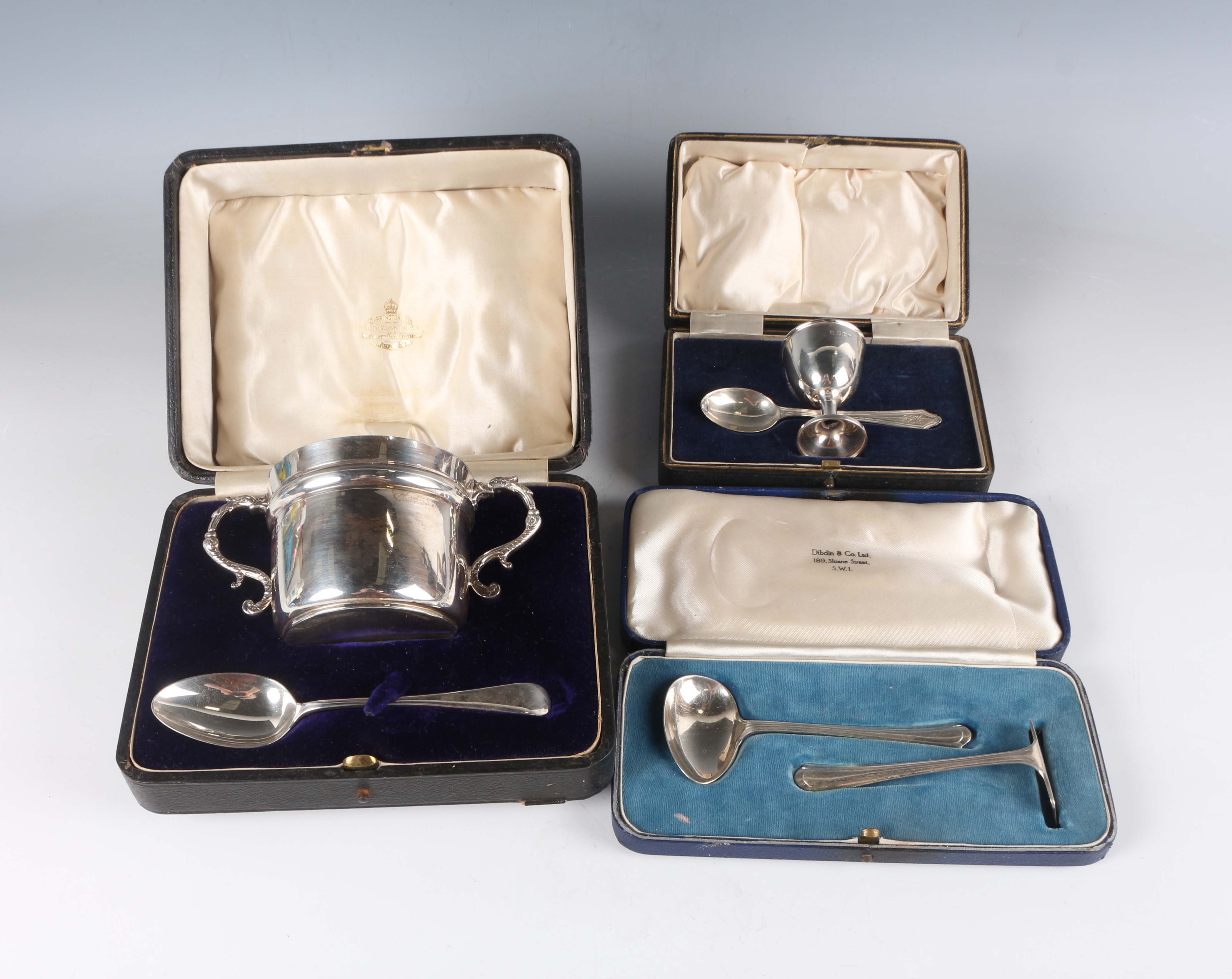An Edwardian silver two-handled christening bowl and spoon, the circular girdled body flanked by two cast dolphin mask and scroll handles, London 1907 and 1908 by S.W. Smith & Co, height of bowl 6.4cm, cased, a silver child's pusher and spoon, cased, and a silver egg cup and a silver spoon, total weight 217.1g.