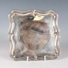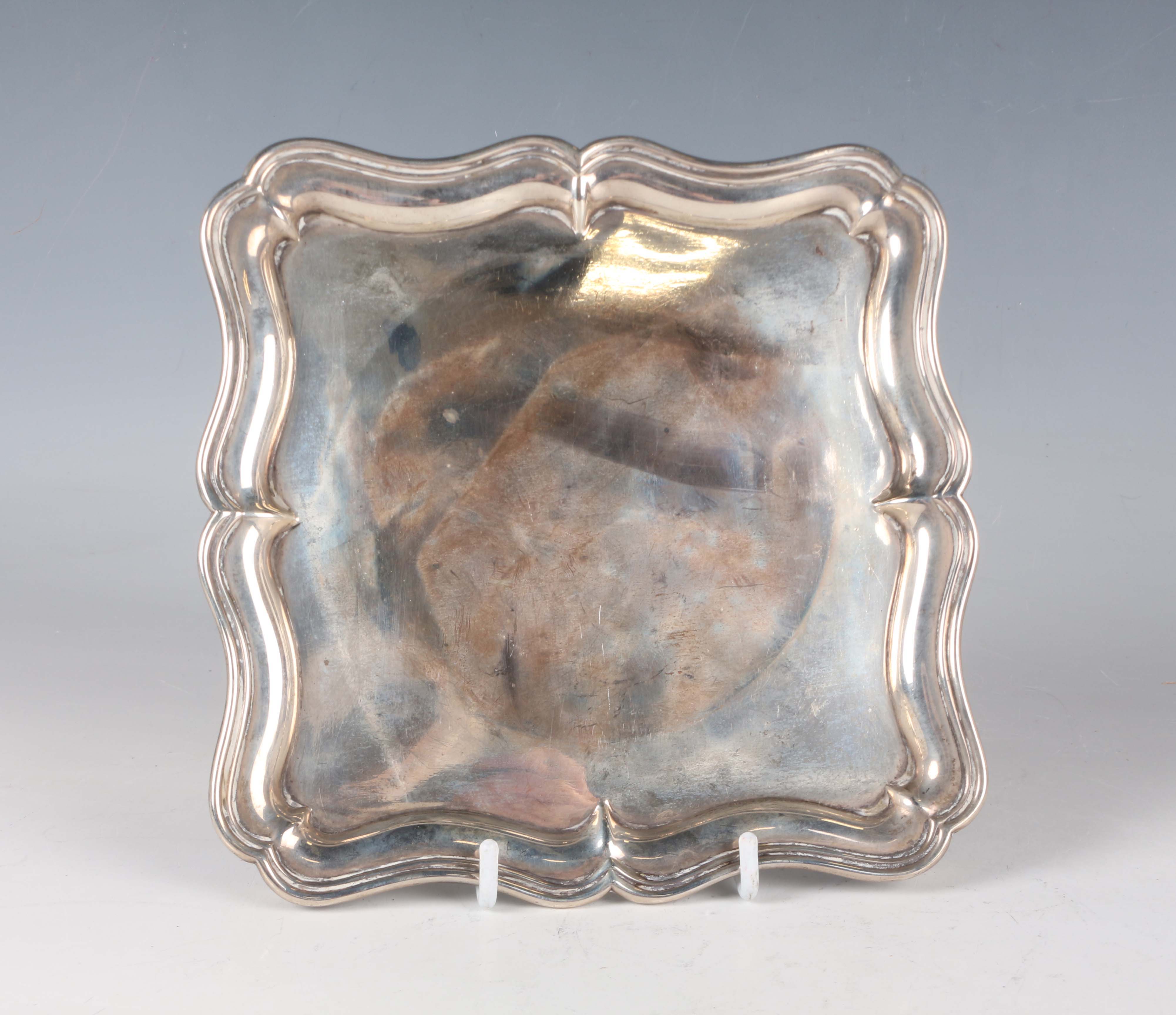 An Edwardian silver square card salver with shaped rim, on bracket feet, Sheffield 1903 by Martin, Hall & Co, weight 292g, width 16.8cm.