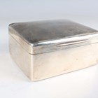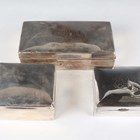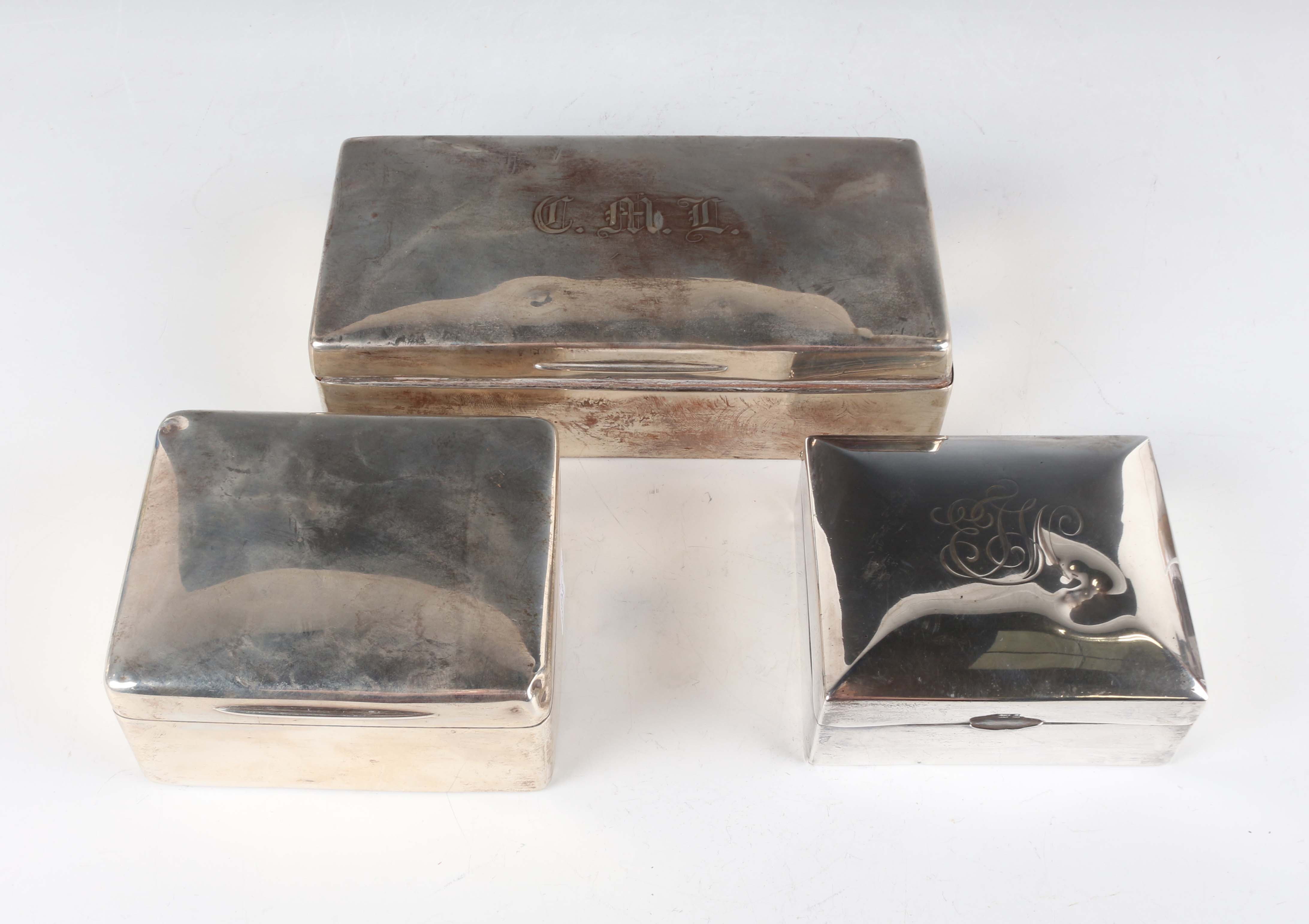 An Edwardian silver rectangular cigarette box, the hinged lid initial engraved, London 1907, length 18cm, a silver square cigarette box, initial engraved, Birmingham 1900, and another silver cigarette box, London 1906 by Goldsmiths & Silversmiths Co Ltd, all wood lined.