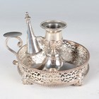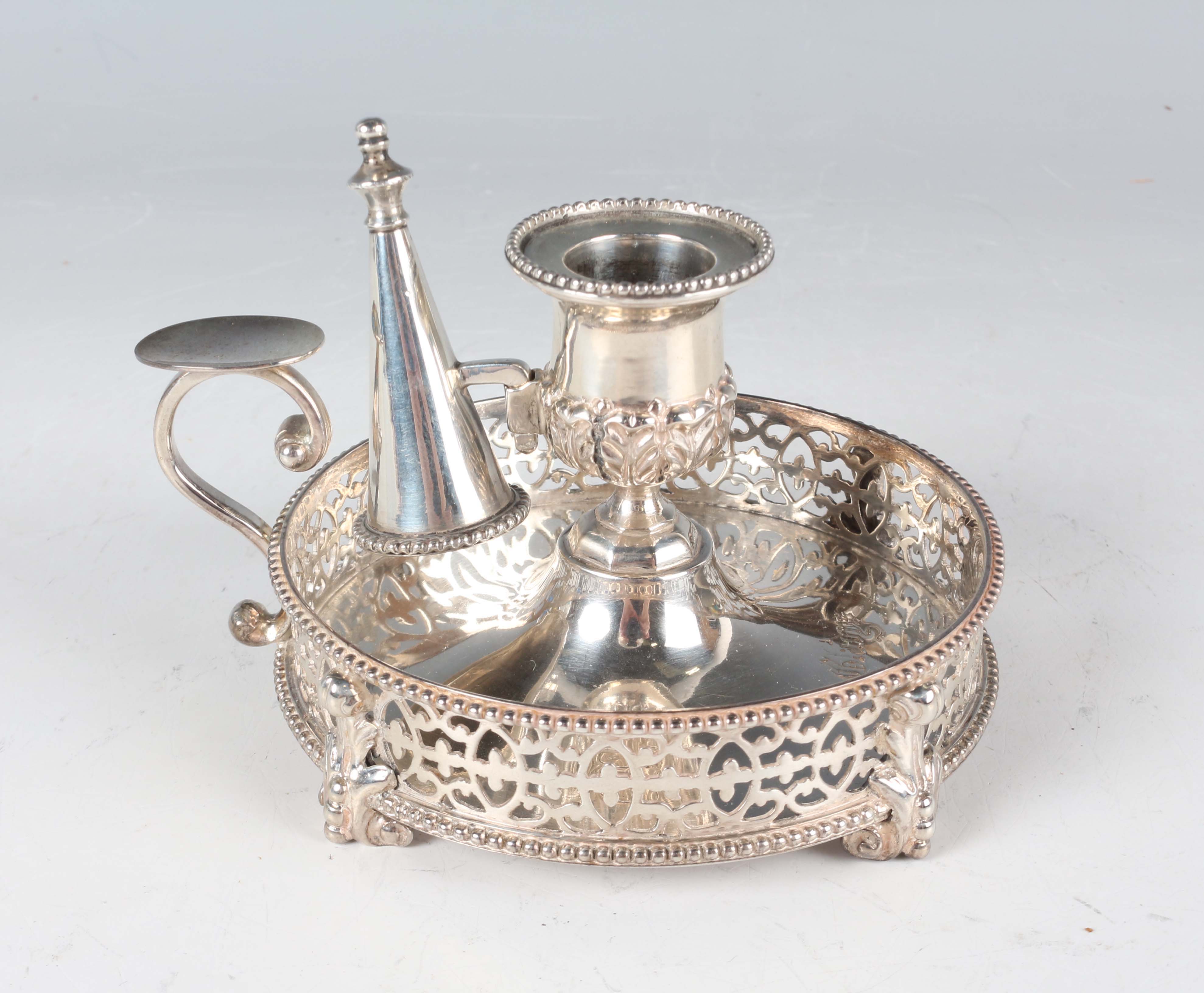 A Victorian silver chamberstick and snuffer, the urn shaped sconce with detachable beaded nozzle and conical beaded snuffer, above a circular pierced galleried stand with scroll handle, on beaded and scroll feet, London 1877 by George Fox, weight 172g, length 10.7cm.