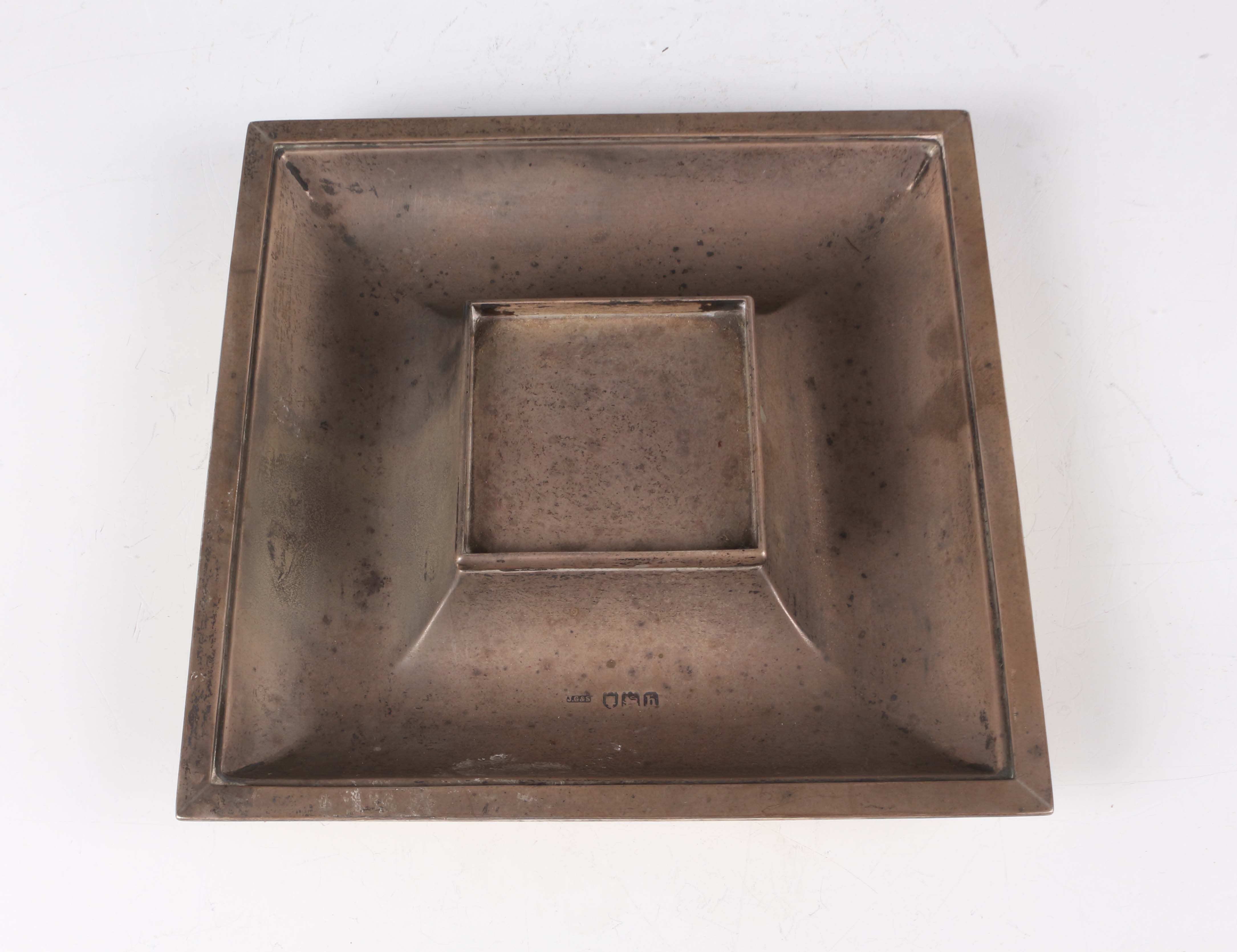 An Edwardian silver square inkstand, London 1903 by John Grinsell & Sons, weight 325g, width 17.2cm (lacking inkwell).