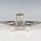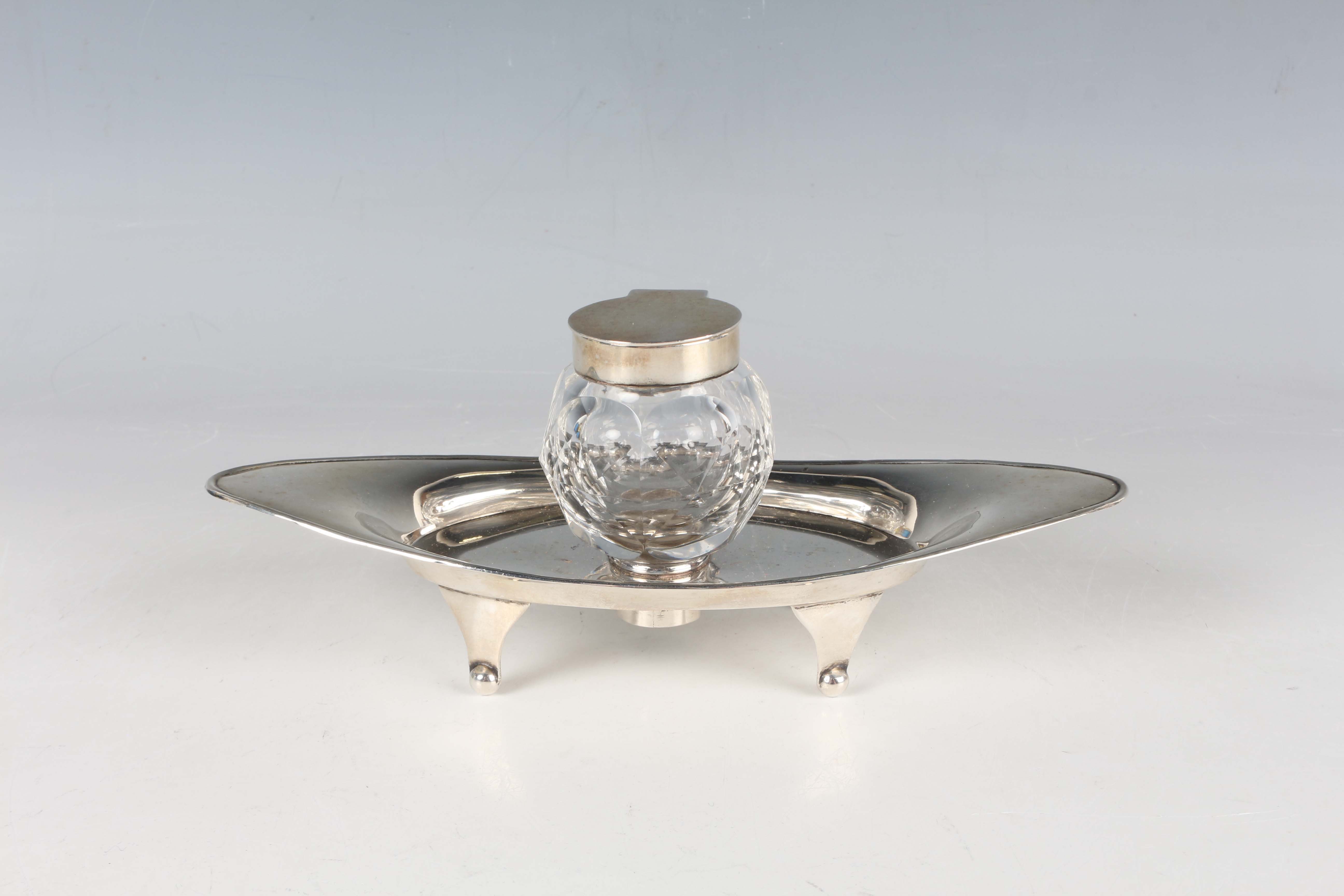 An Edwardian silver inkstand of elliptical form, fitted with a cut glass inkwell with silver collar and hinged lid, on beaded and tapering legs, Chester 1903 by W.J. Myatt & Co, weight of stand only 59.9g, length 18.2cm.