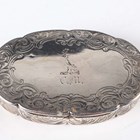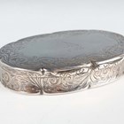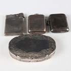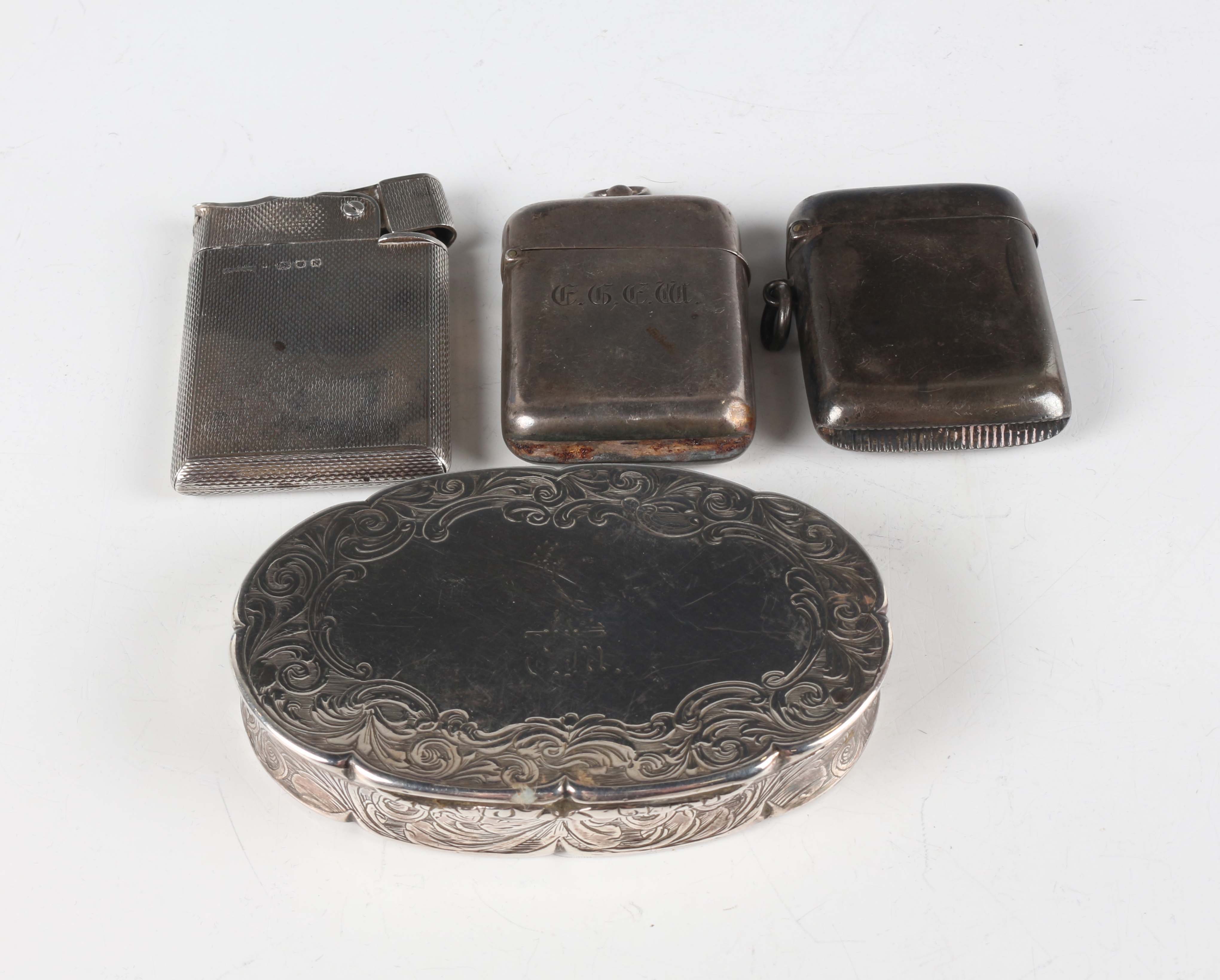 A Victorian silver oval snuff box, the hinged lid crest engraved, framed by engraved scrolls above similarly decorated sides and base, Birmingham (date letter worn) by Edward Smith, length 8cm, together with two silver vesta cases, total weight 135.5g, and a silver mounted lighter, height 5.4cm.