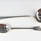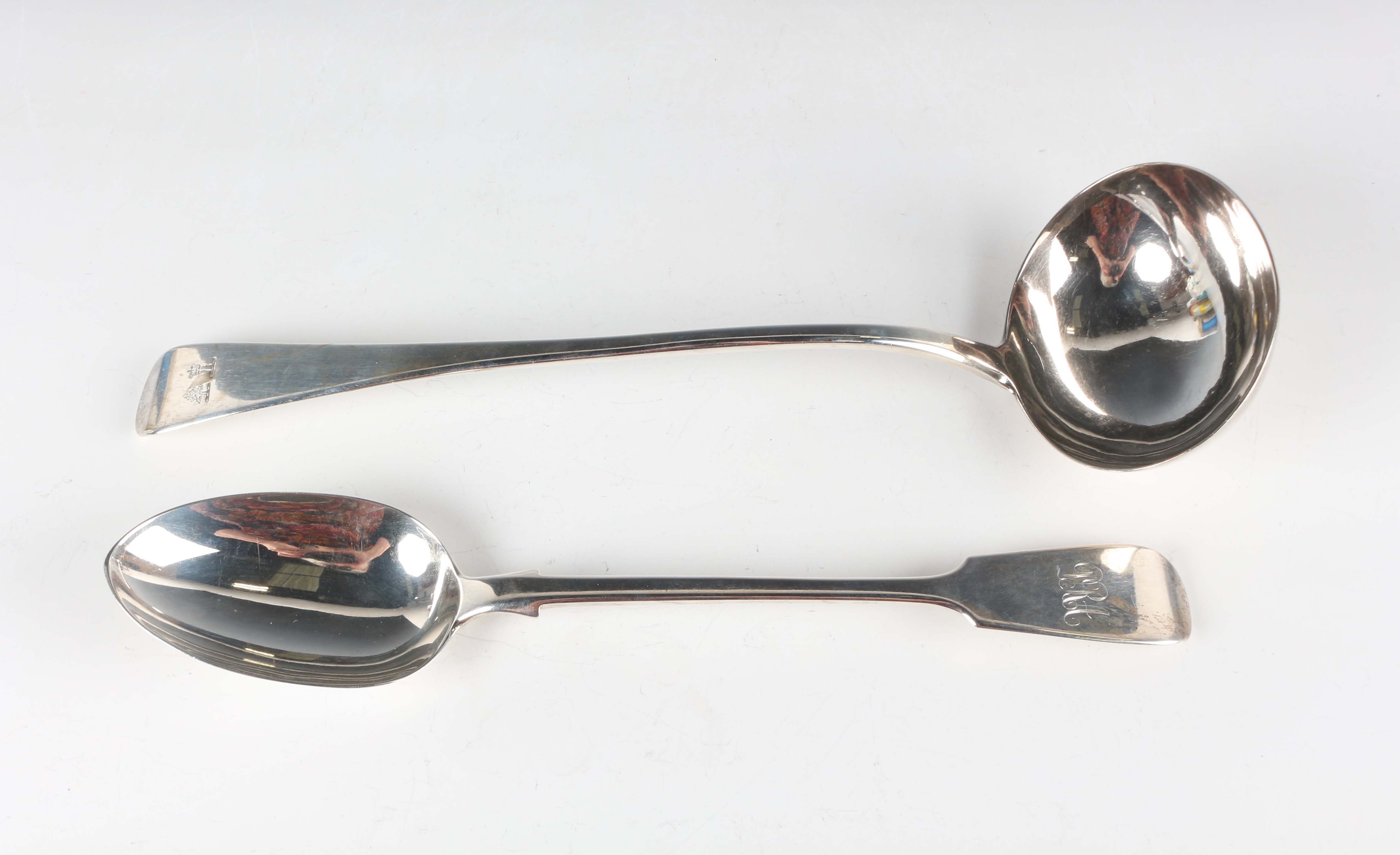 A George III silver Old English pattern soup ladle, London 1811 by Solomon Hougham, weight 195.6g, length 34cm, and a silver Fiddle pattern tablespoon, London 1868 by George Adams, weight 155.3g, length 30.5cm.