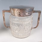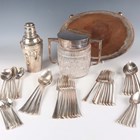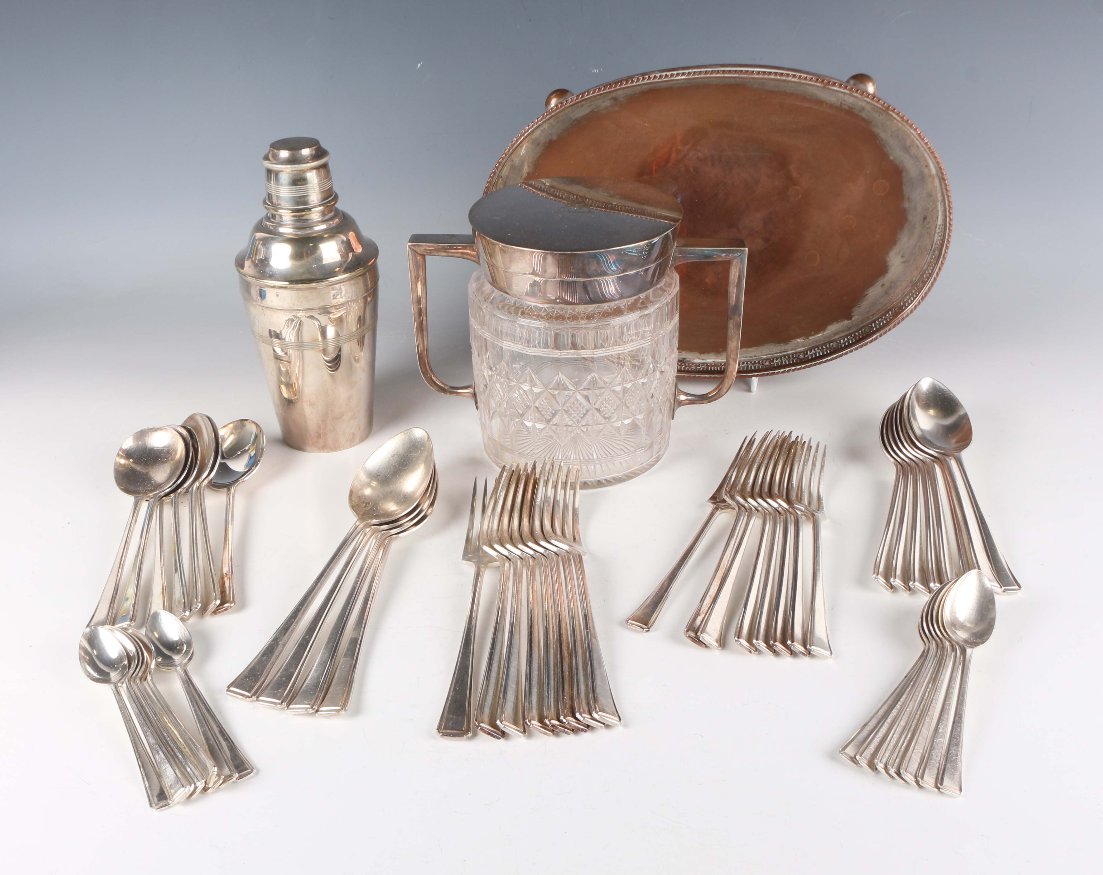 An Edwardian plated and cut glass biscuit barrel of cylindrical form with hinged lid, crest engraved with a stag, flanked by two angular handles, by John Grinsell & Sons, height 15.5cm, and a small group of other plated items, comprising a cocktail shaker, an oval galleried tray and a part canteen of cutlery.