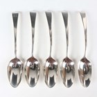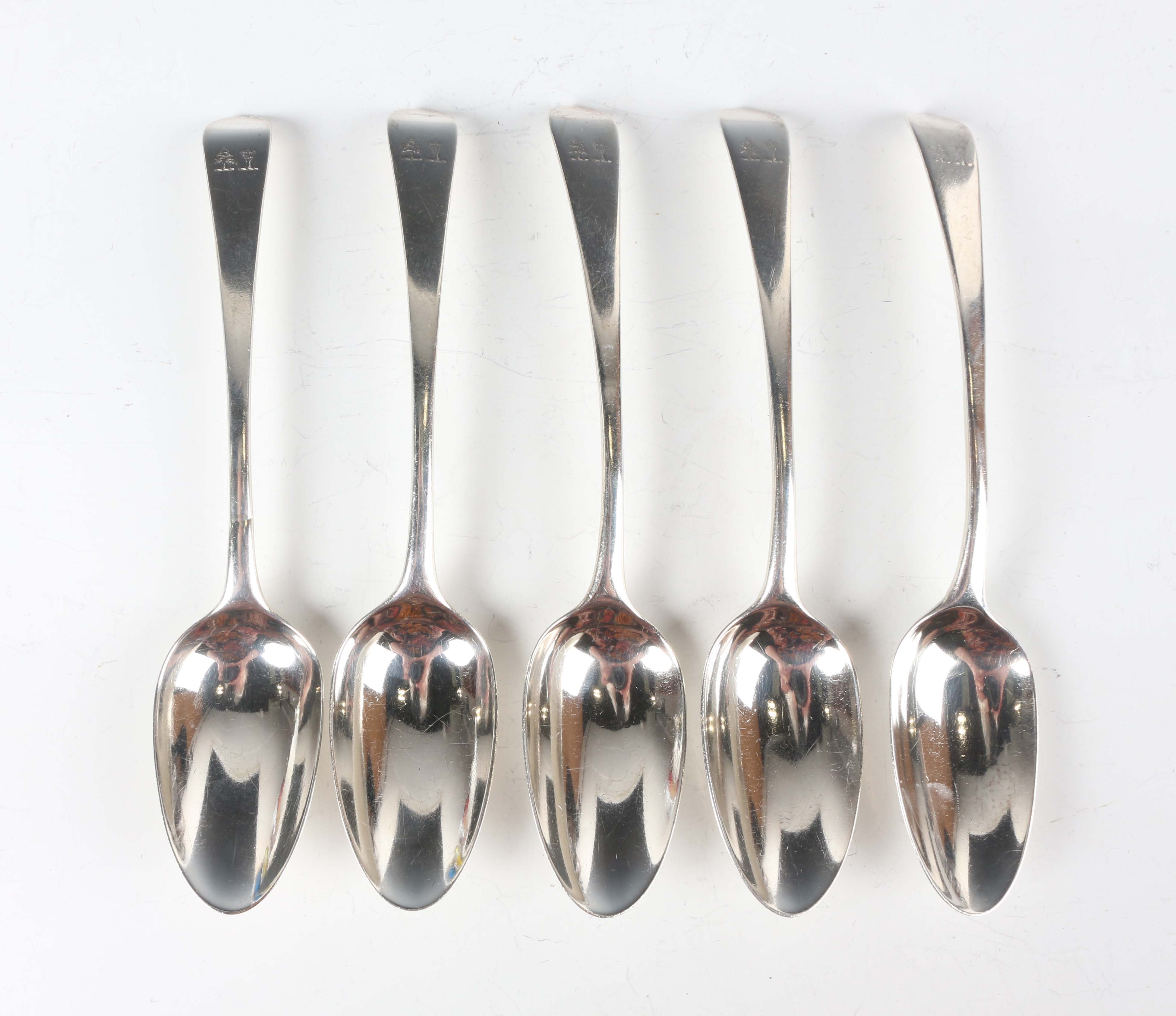 A set of five George III silver Old English pattern dessert spoons, London 1775 by William Sumner & Richard Crossley, weight 172.9g, length 17cm.