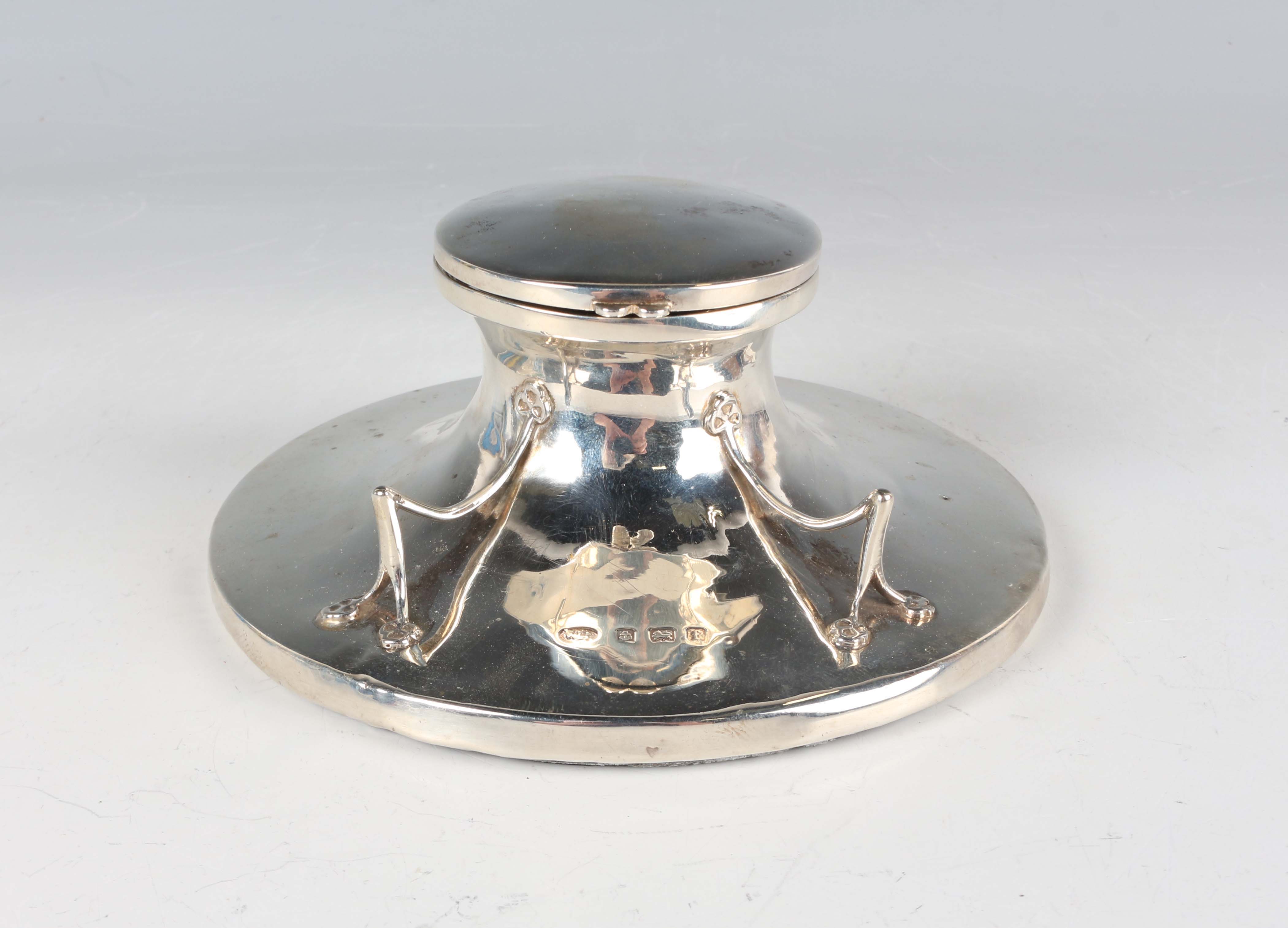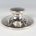 An Edwardian silver mounted circular capstan inkwell, the front applied with wirework pen rests, Birmingham 1905 by William Adams Ltd, diameter 12.7cm.