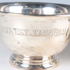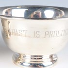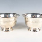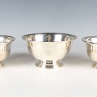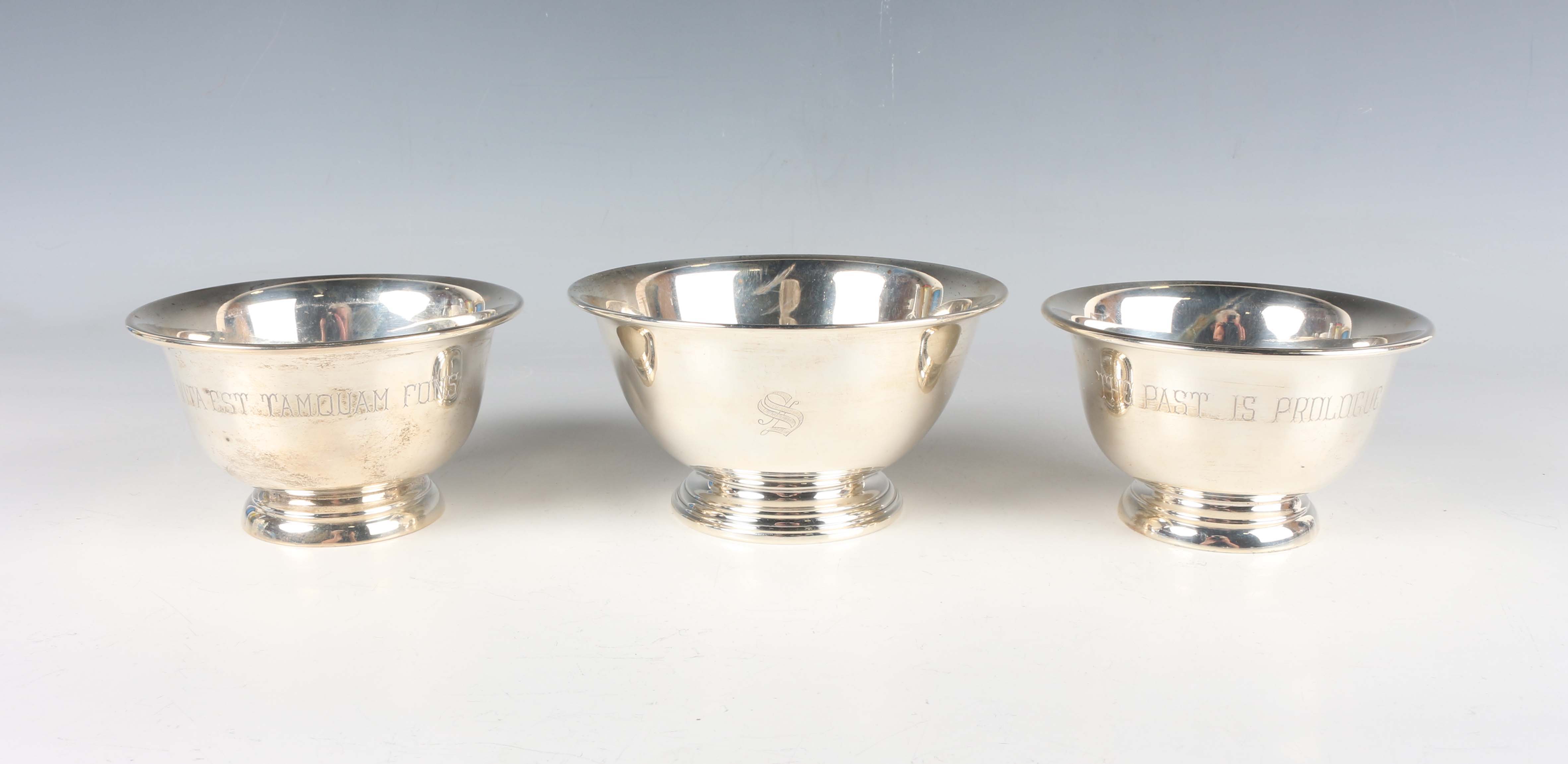 A pair of American sterling circular bowls, each motto engraved, of flared circular form on a circular foot, by S. Kirk & Son, Baltimore, height 6.5cm, and another similar sterling bowl, initial engraved and dated '1941' to base, height 7cm, total weight 339.1g.