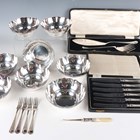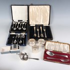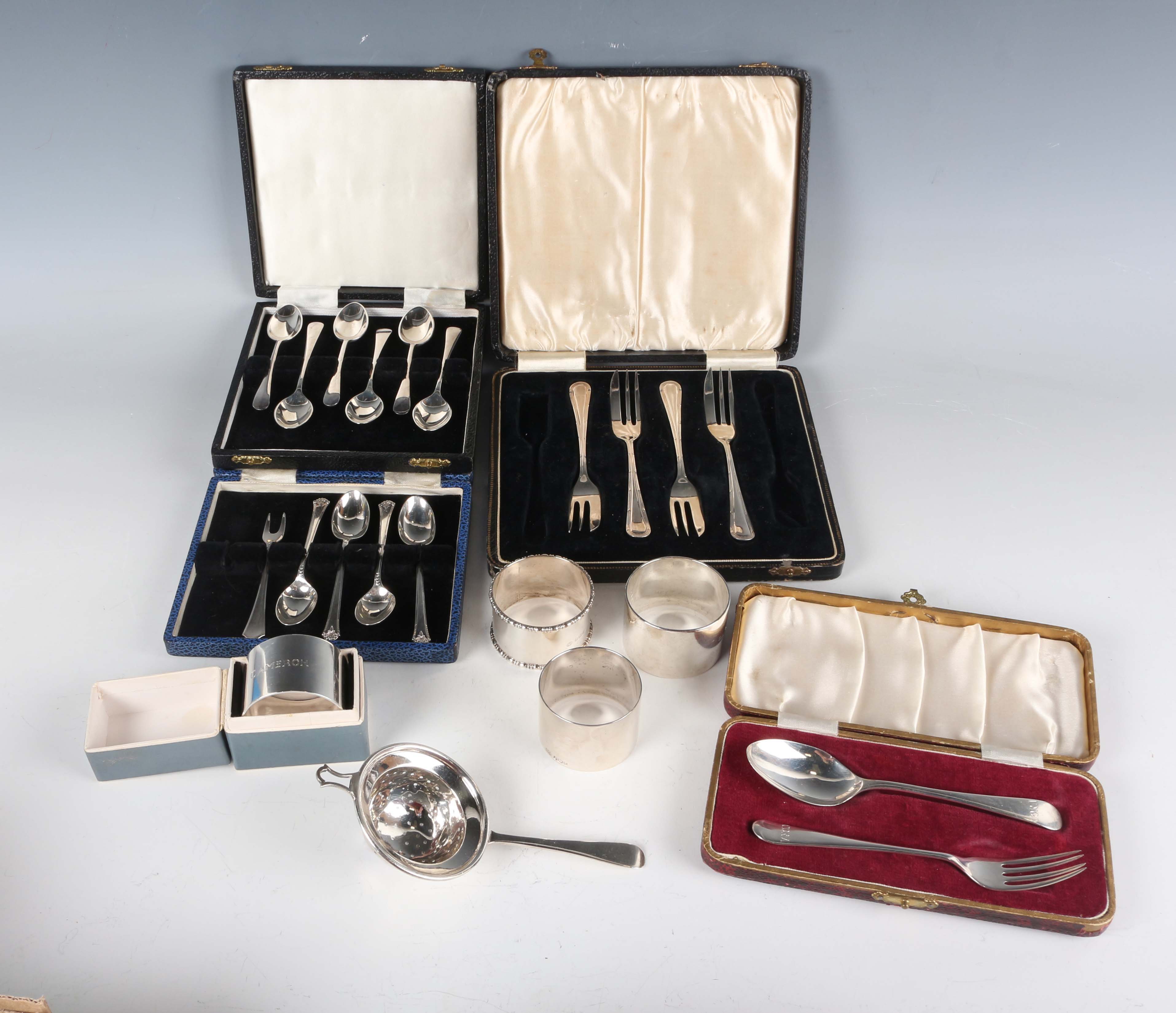 A small group of silver, including a christening spoon and fork, Sheffield 1958, cased, four napkin rings and a tea strainer, London 1951, total weight 425.8g, together with a set of six silver handled dessert knives, cased, and a small group of plated items, including a pair of fish servers, cased, and a set of eight dessert bowls by Mappin & Webb.