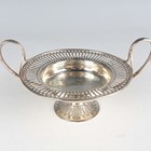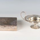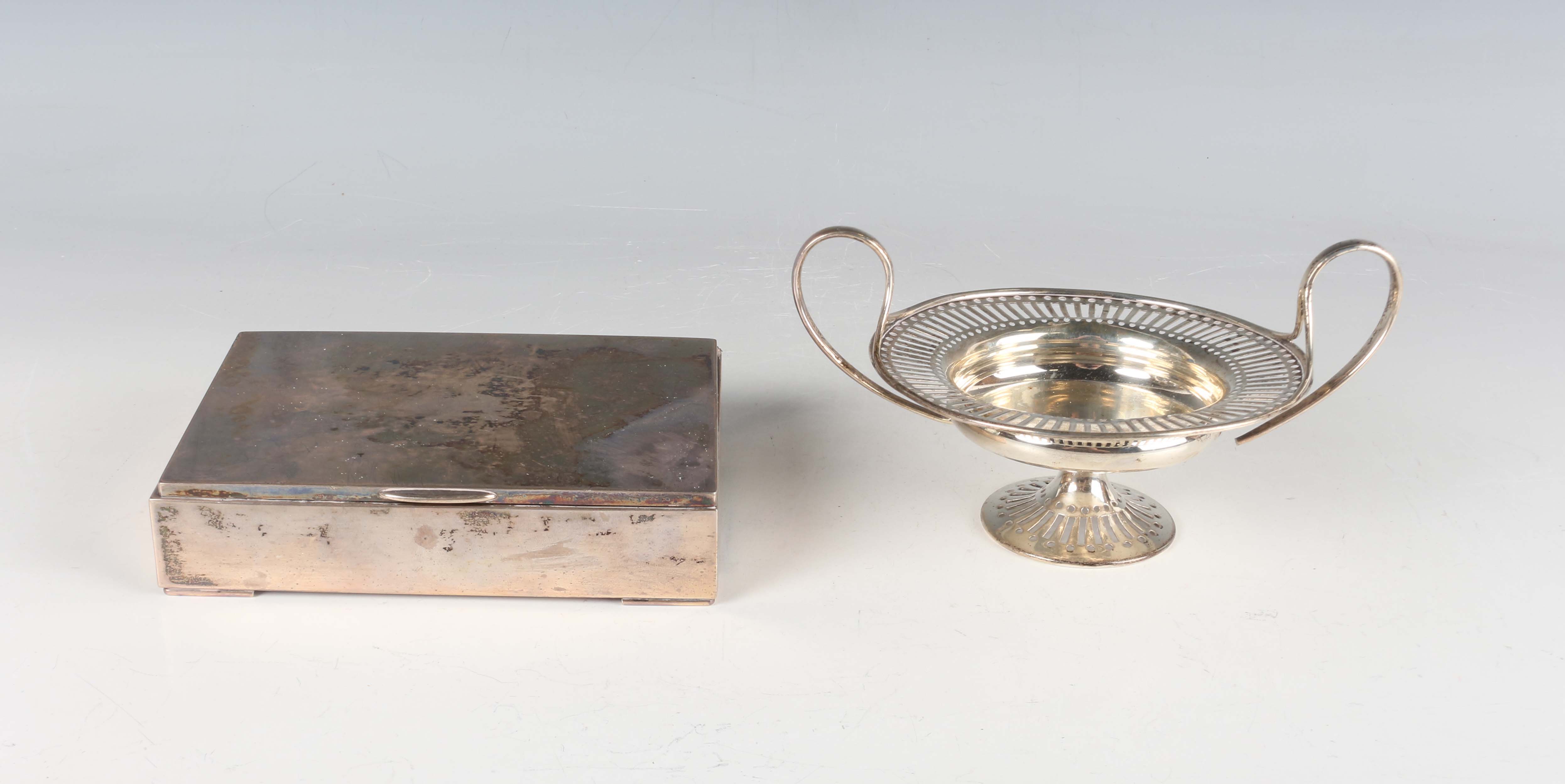 An Edwardian silver bonbon tazza, the circular shallow bowl with pierced rim, flanked by two scroll handles, on a tapering stem and pierced circular foot, London 1908 by Mappin & Webb, weight 112.1g, height 8cm (faults), and an American sterling rectangular cigarette box, the hinged lid interior presentation engraved, on bracket feet, by H. Nils, New York, length 13.5cm.