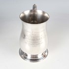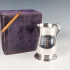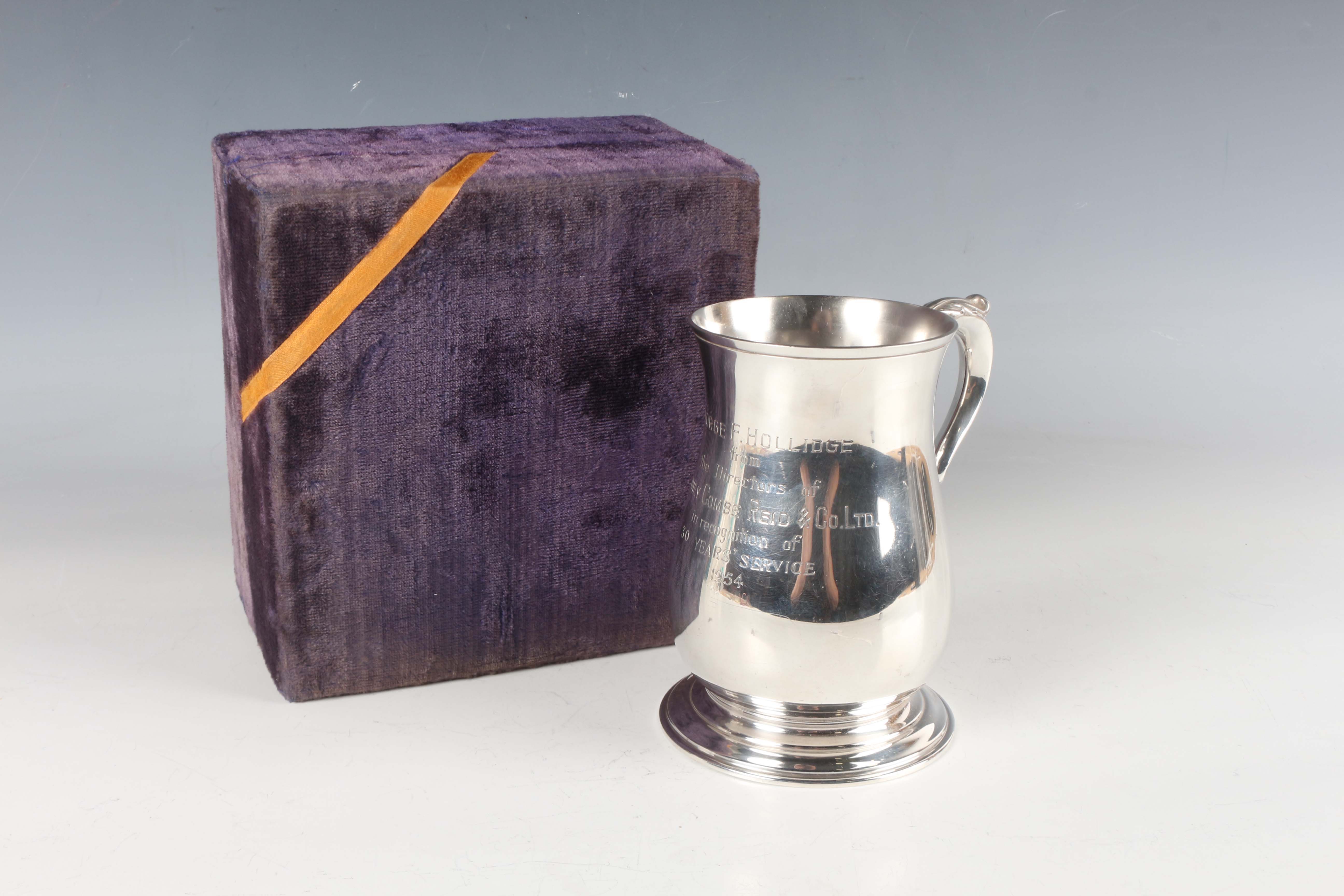 An Elizabeth II silver tankard of baluster form with foliate capped scroll handle, inscription engraved, on a circular foot, Birmingham 1965 by Poston Products Ltd, weight 382.2g, height 12.9cm, cased.