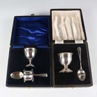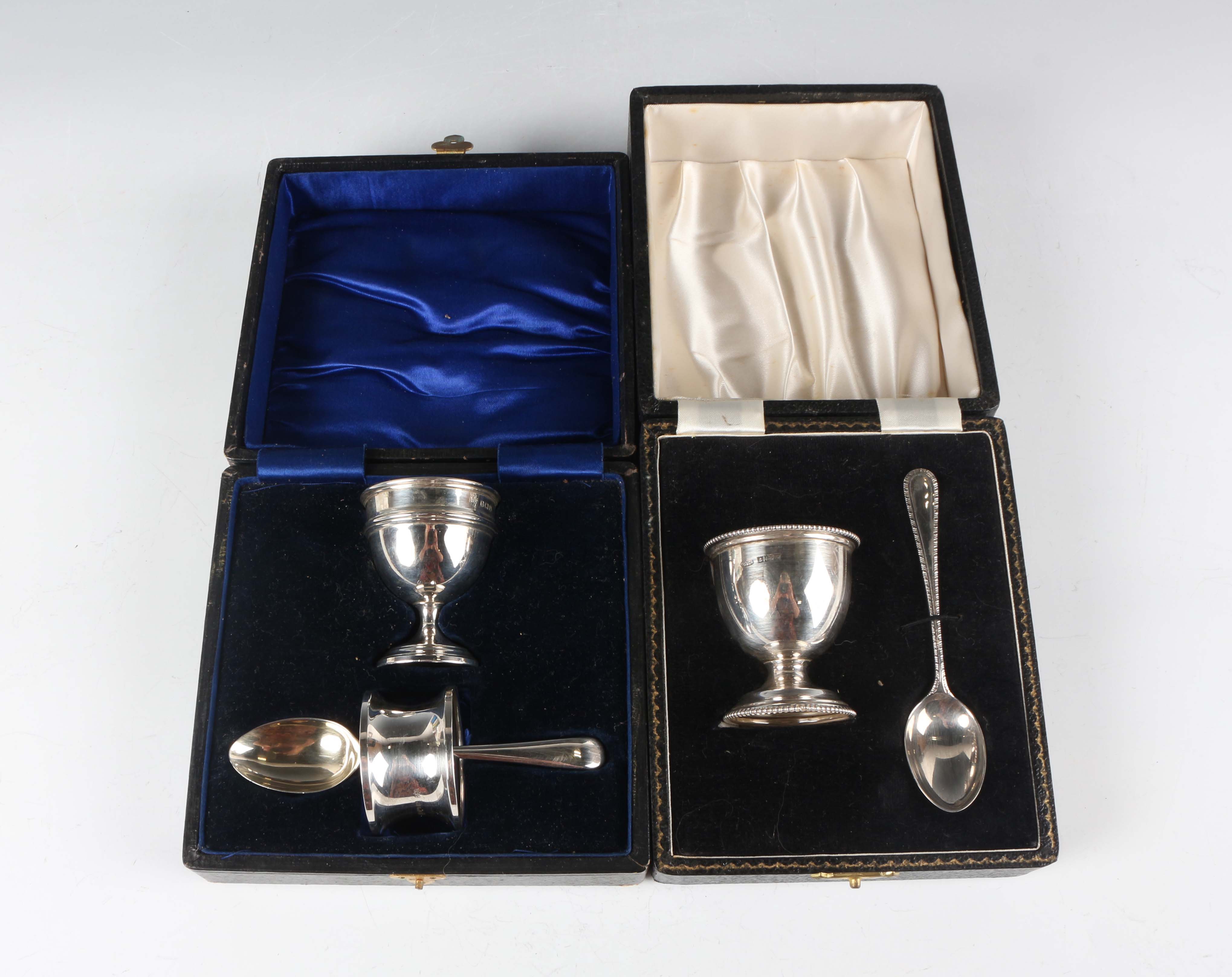 A George V silver christening egg cup, spoon and napkin ring, Birmingham 1914 by Jones & Crompton, cased, and a silver christening egg cup and spoon, Birmingham 1964 and 1965, cased, total weight 71.4g.