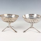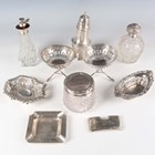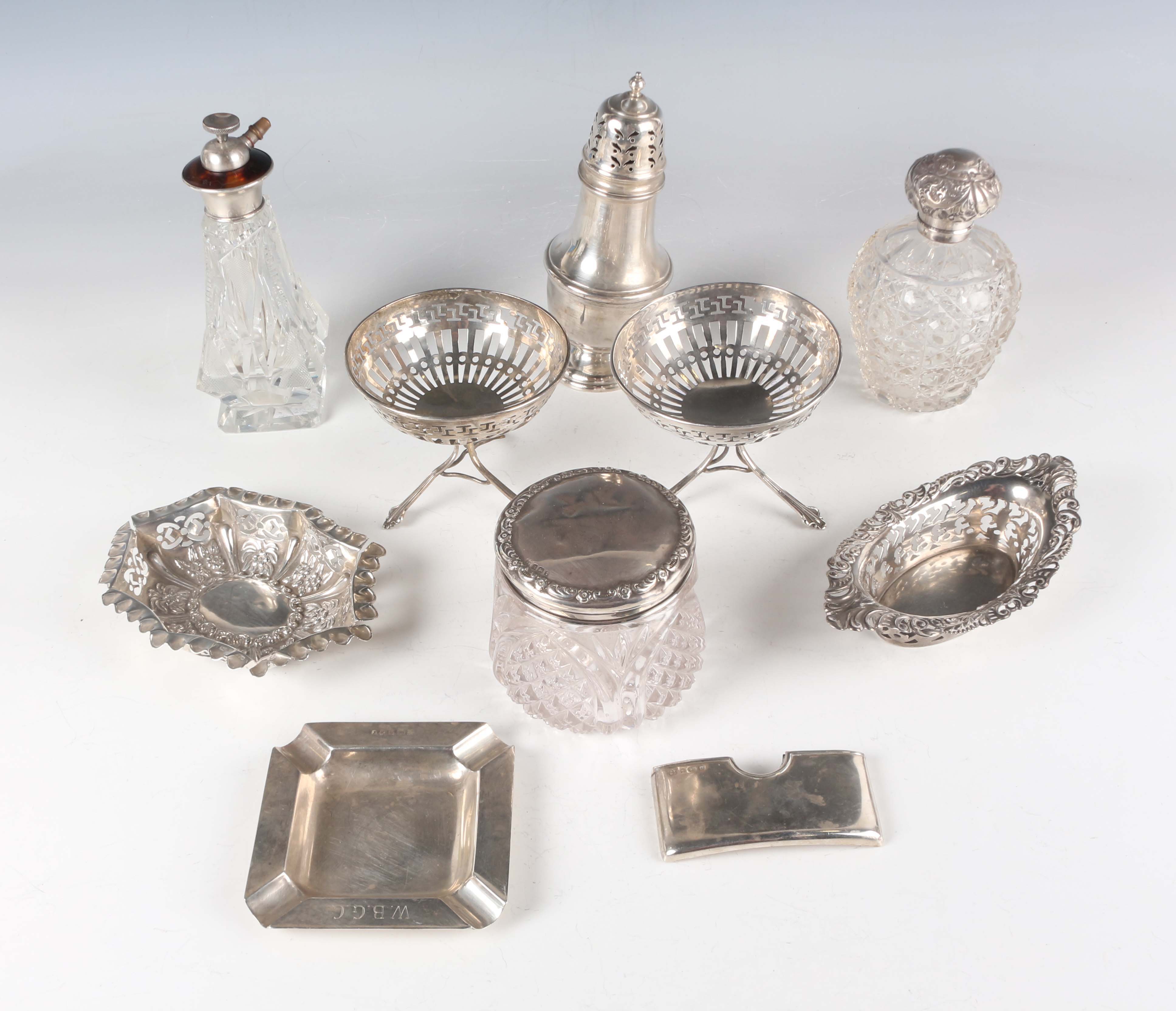 A pair of Edwardian silver bonbon tazzas, each circular pierced bowl above three flared legs, Sheffield 1907, height 8cm, and a small group of other silver, including a sugar caster, two bonbon dishes and two silver mounted cut glass dressing table items, total weight excluding glass 392g, together with a silver mounted cut glass atomizer, height 15cm.