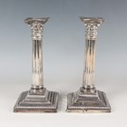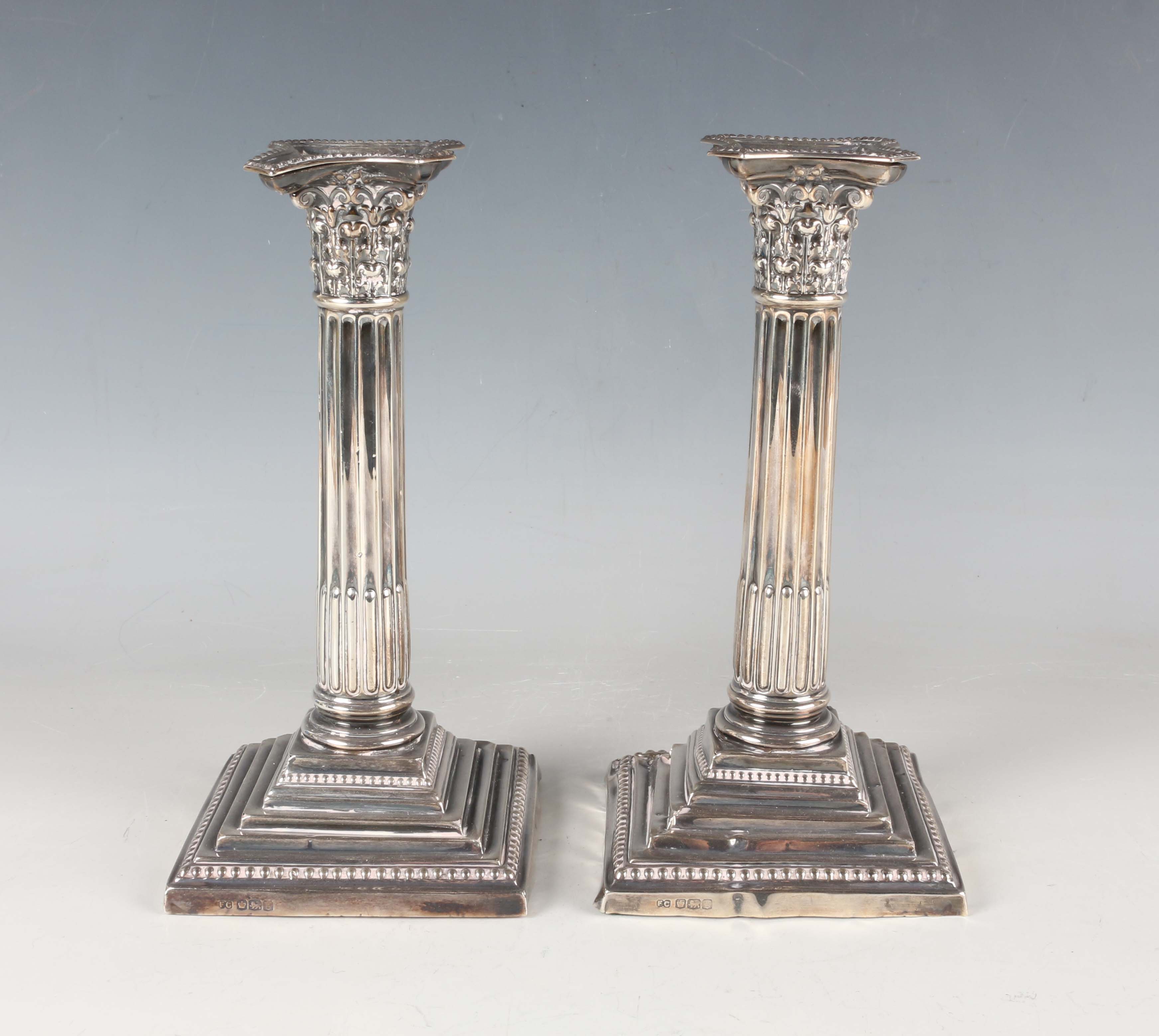 A pair of George V silver Corinthian column candlesticks, each with detachable beaded nozzle, on a square stepped and beaded base, Sheffield 1924 by Frank Cobb, height 21cm.