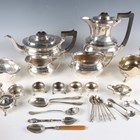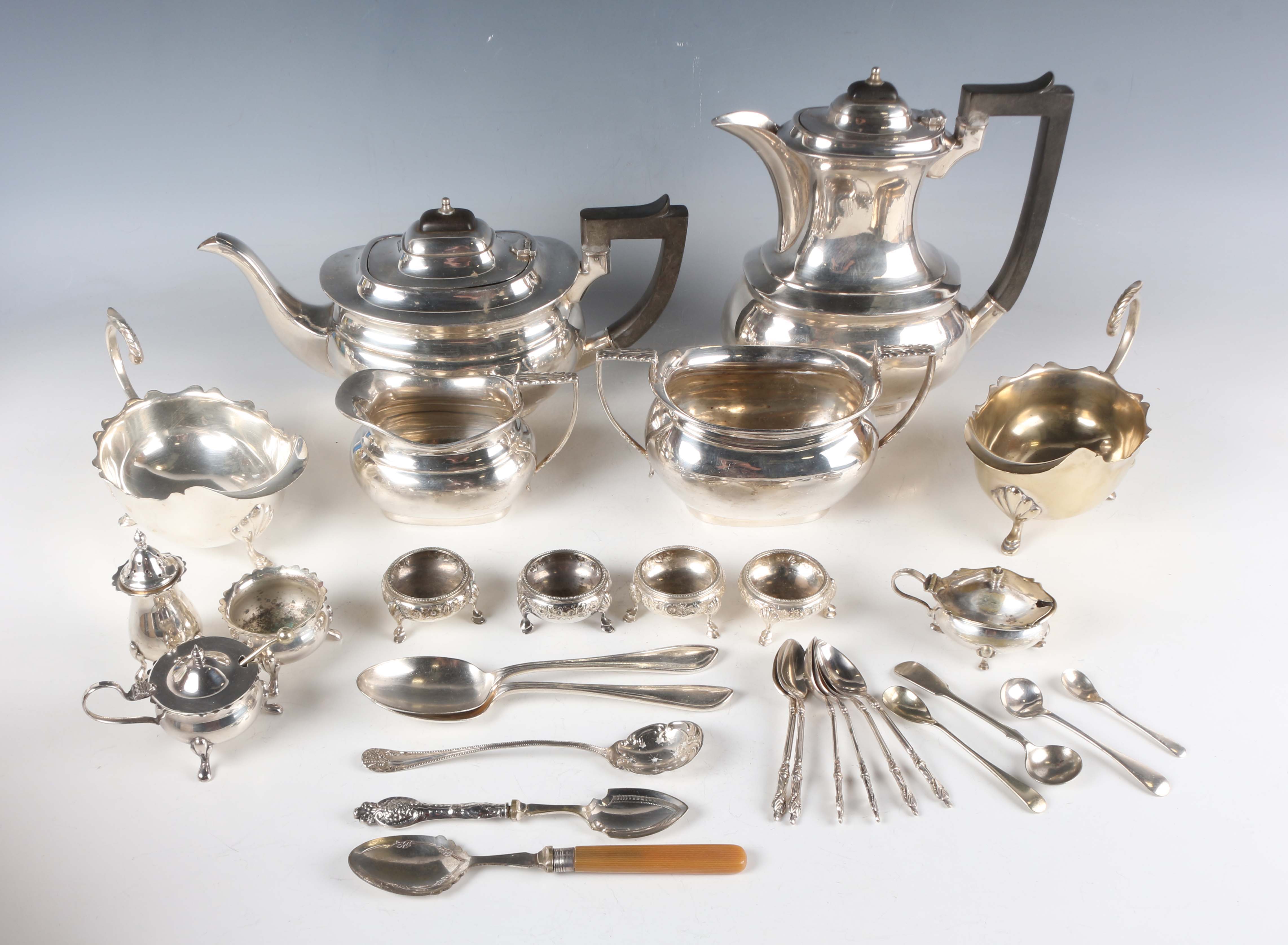 A small group of plated items, including a four-piece tea set, a set of four circular salts and a pair of sauceboats.
