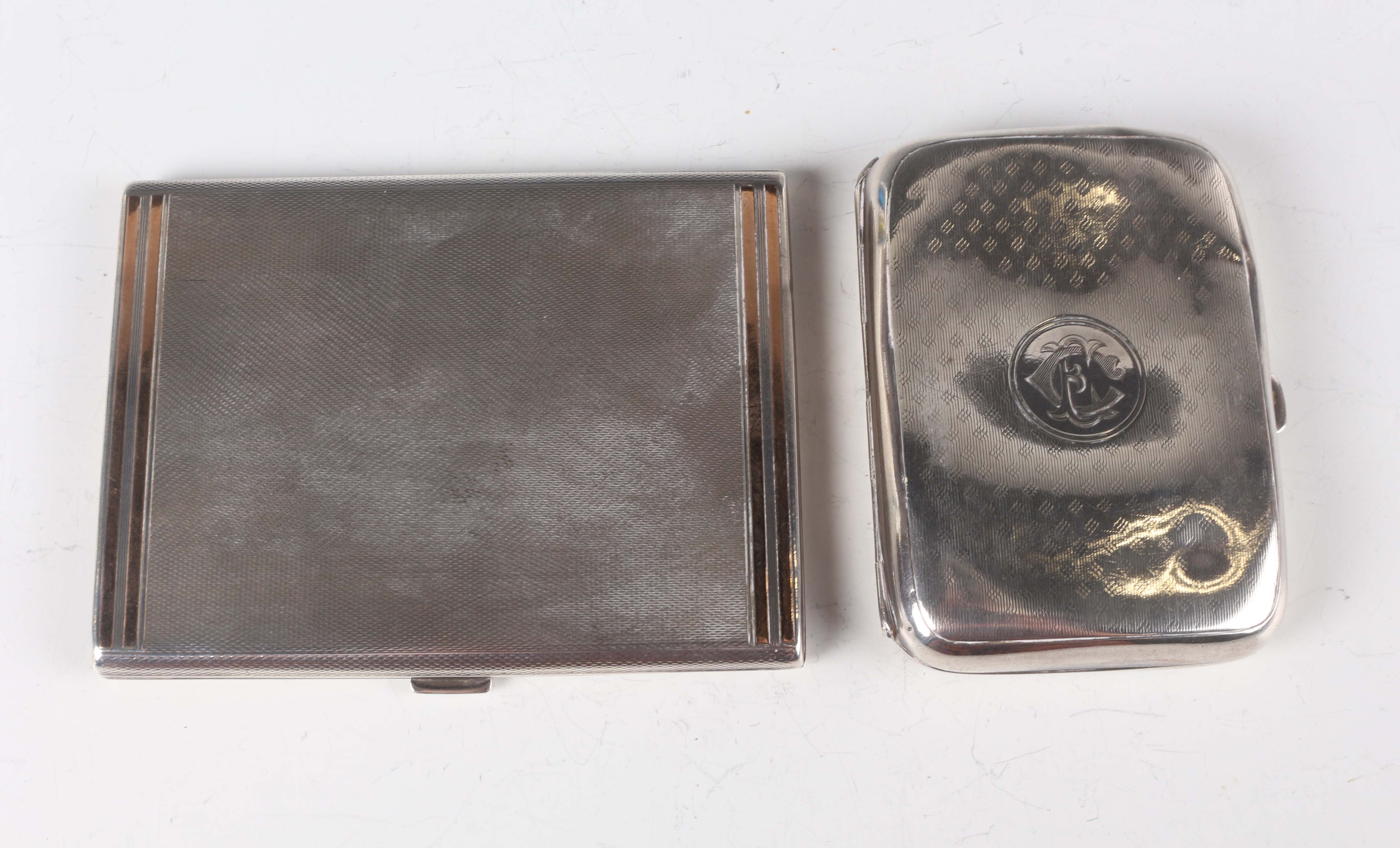 A George VI silver rectangular cigarette case with engine turned decoration, London 1938 by Thomas William Lack, length 11.3cm, and another silver cigarette case, Sheffield 1921, total weight 259.8g.