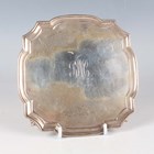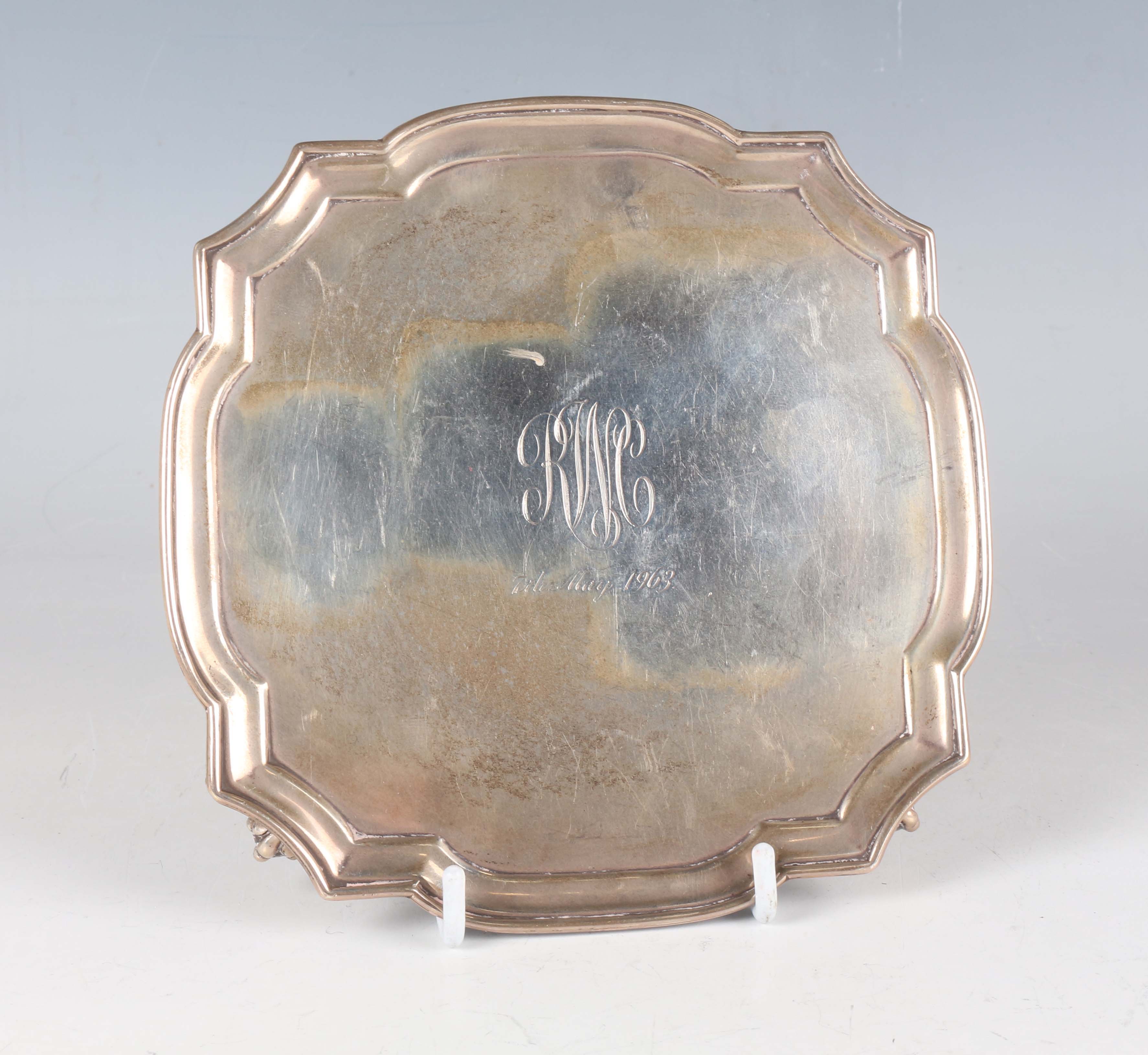 A George V silver shaped square card salver, initial and date engraved, raised on claw and ball feet, London 1928, weight 197.8g, width 15.2cm.