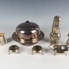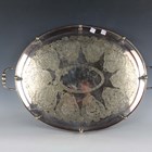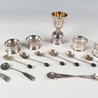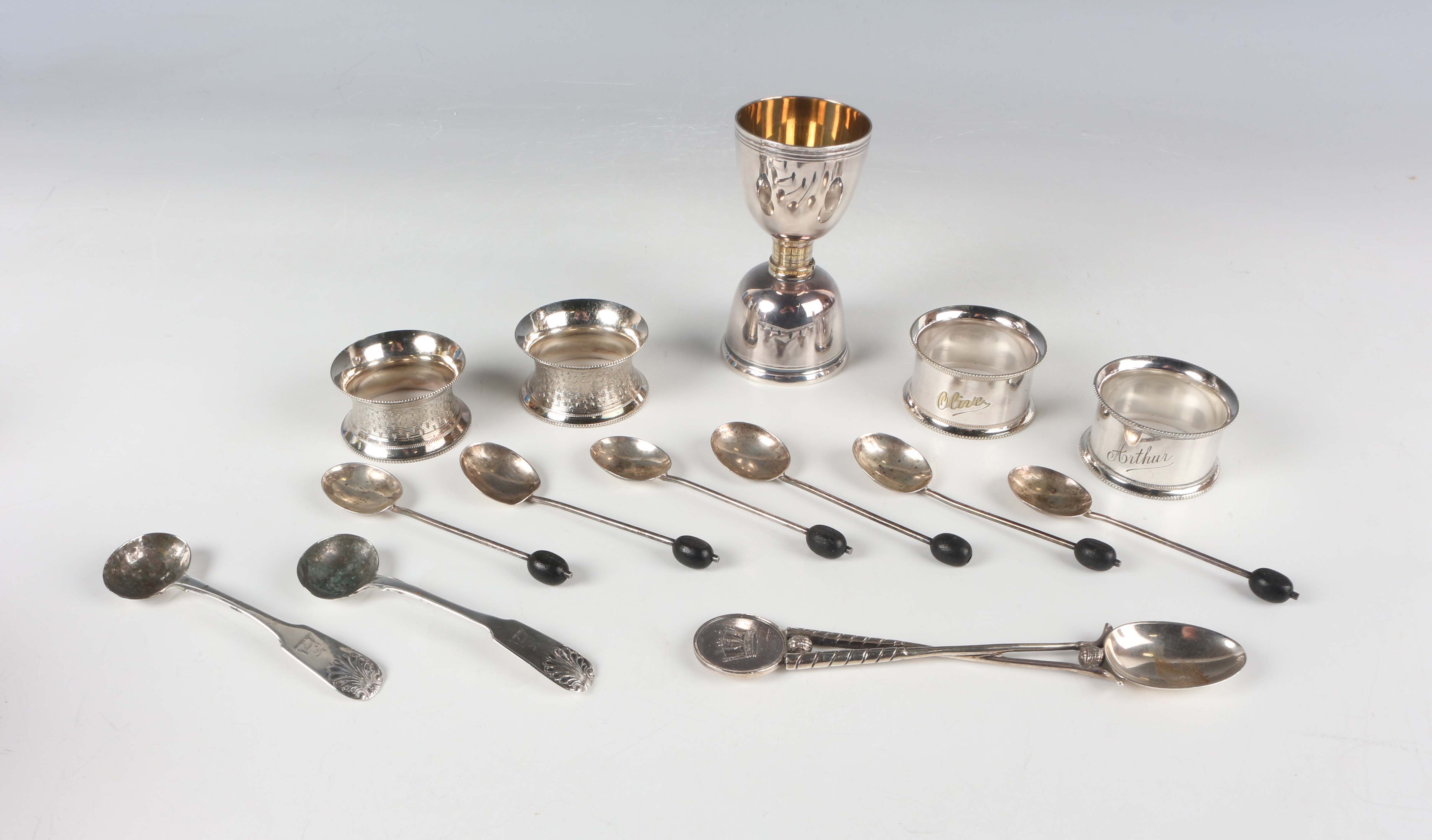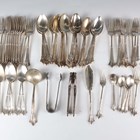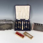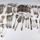 A group of plated items, including an oval two-handled galleried tea tray, a basket with swing handle, various cutlery, including a part canteen of Albany pattern cutlery, a goblet and flask, the detachable cup revealing a screw top flask base, height 8.8cm.