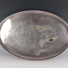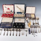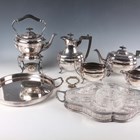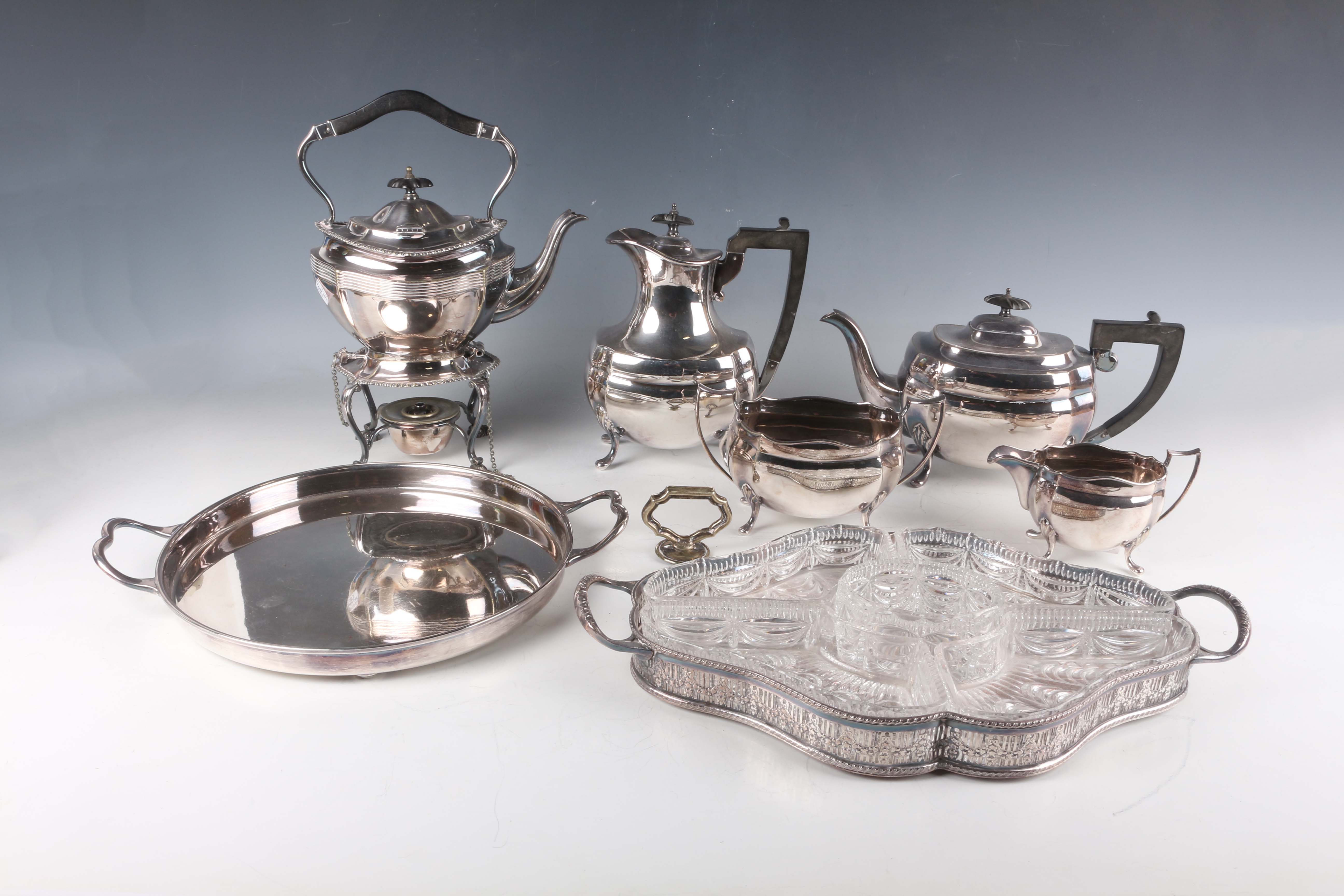 A group of plated items, including an oval galleried tea tray, a spirit kettle-on-heater base with burner, a four-piece tea set and various cutlery.
