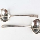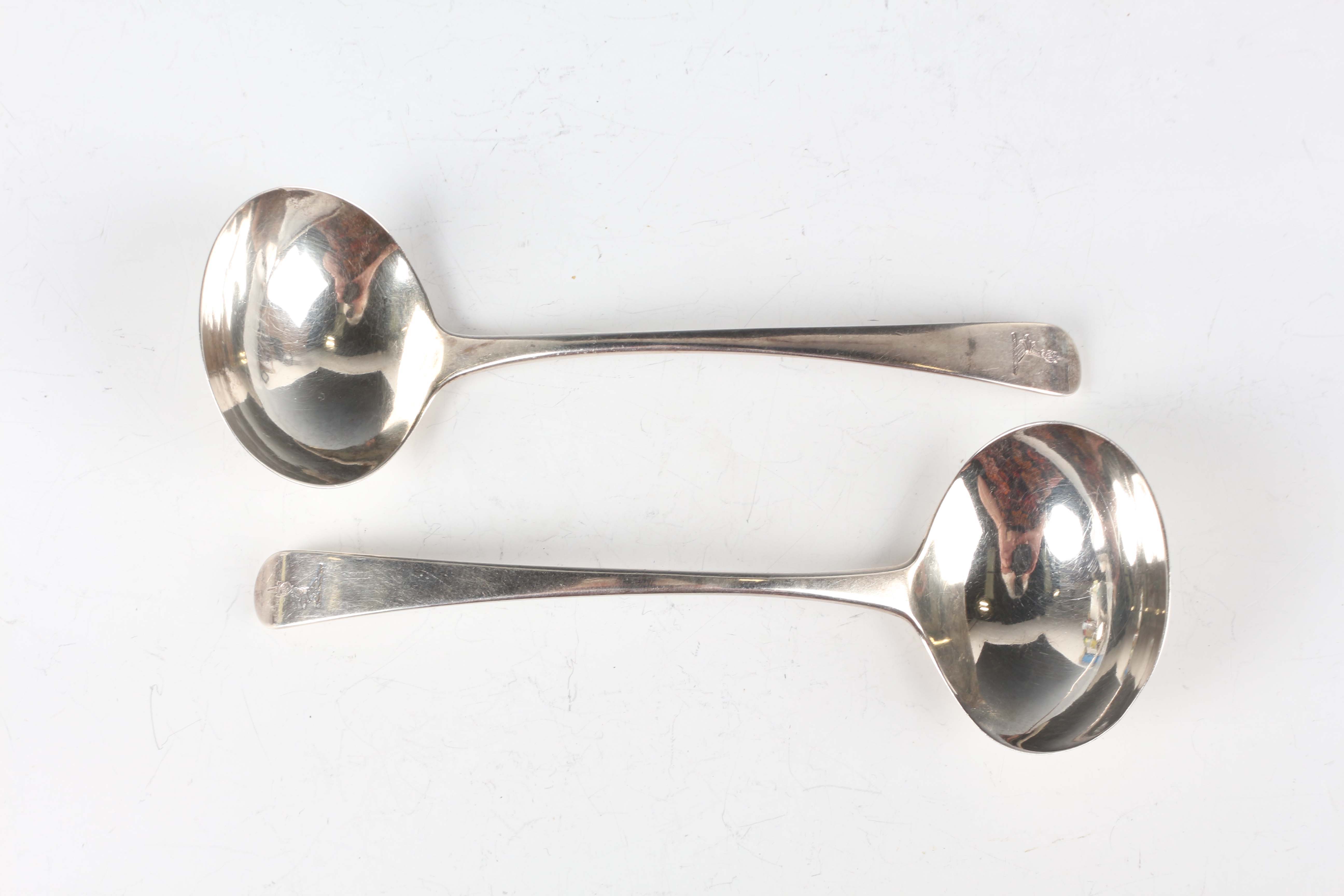 A pair of 18th century silver Old English pattern sauce ladles, crest engraved, London, date letter worn, by George Smith III, weight 96g.