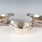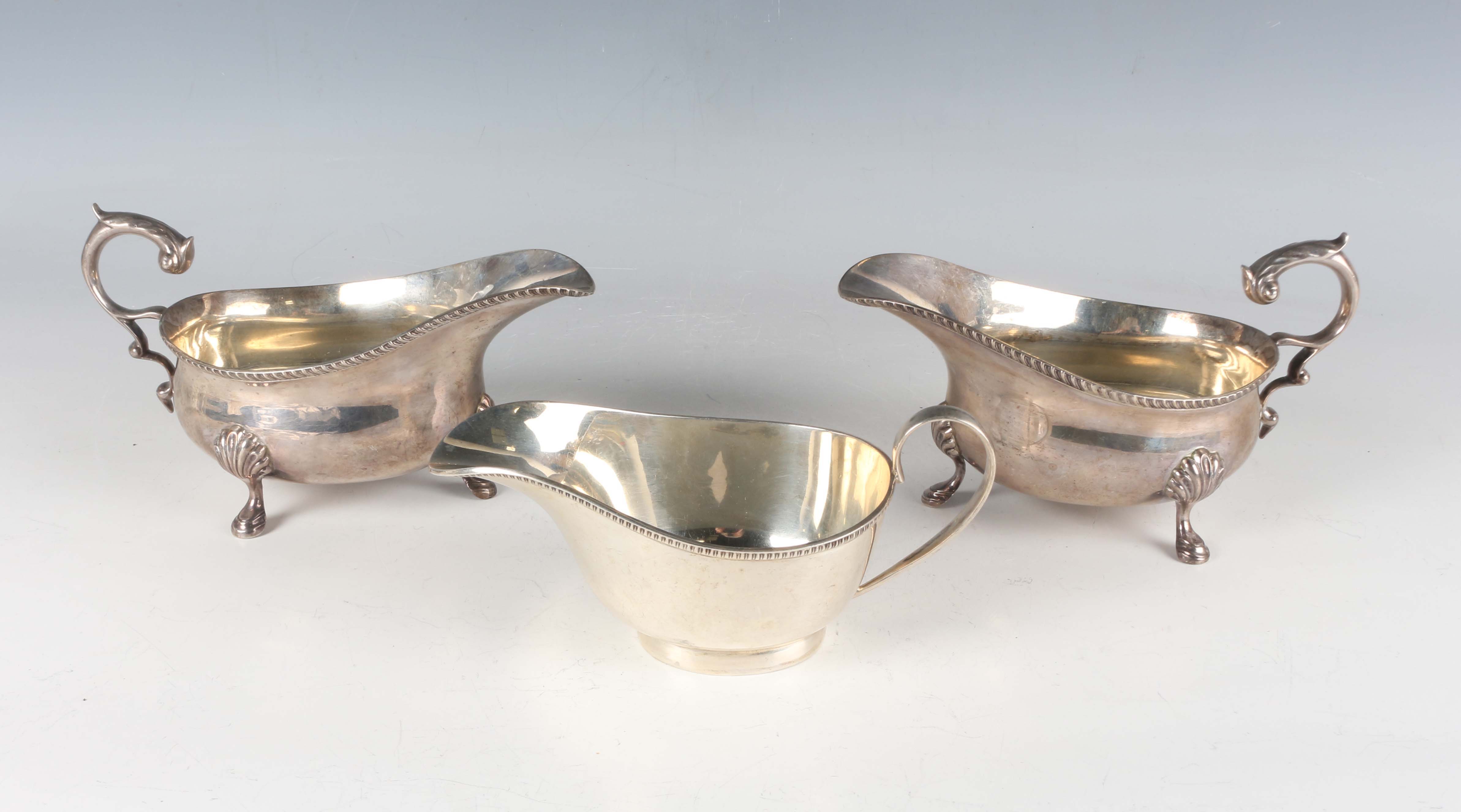 A pair of George V silver sauceboats, each with a gadrooned rim, flanked by a foliate capped flying scroll handle, raised on scallop shell shouldered scroll legs terminating in hoof feet, London 1934 by Goldsmiths & Silversmiths Co Ltd, length 18cm, and another silver sauceboat, Sheffield 1937, total weight 638.4g.