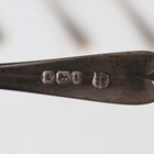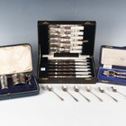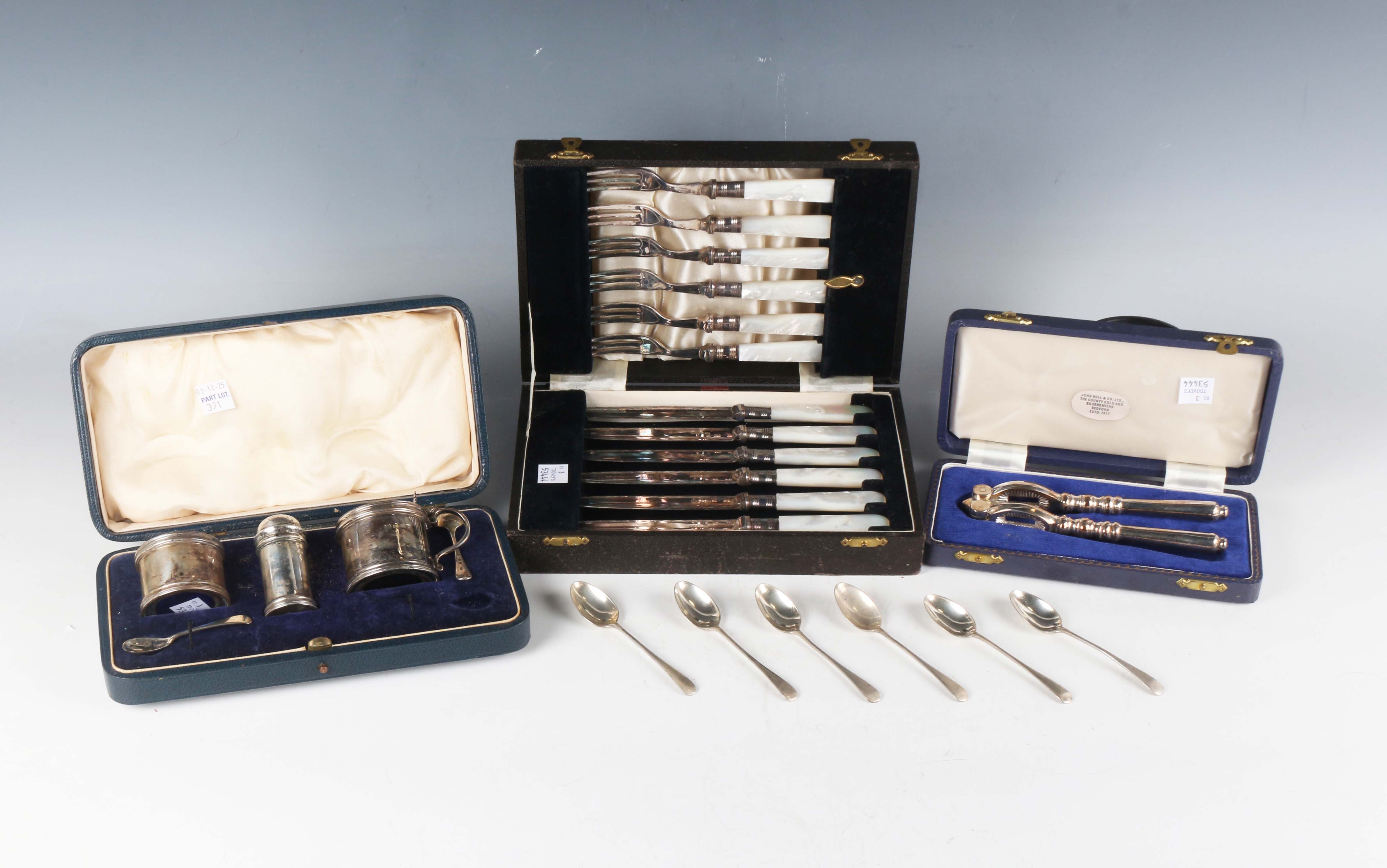 A George V silver three-piece condiment set of cylindrical form, comprising mustard, salt and pepper caster, Birmingham 1931, cased, two silver condiment spoons and a set of six silver coffee spoons, weight excluding mustard 144.9g, together with a pair of plated nutcrackers, cased, and a set of six plated and mother-of-pearl handled dessert knives and forks, cased.