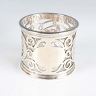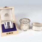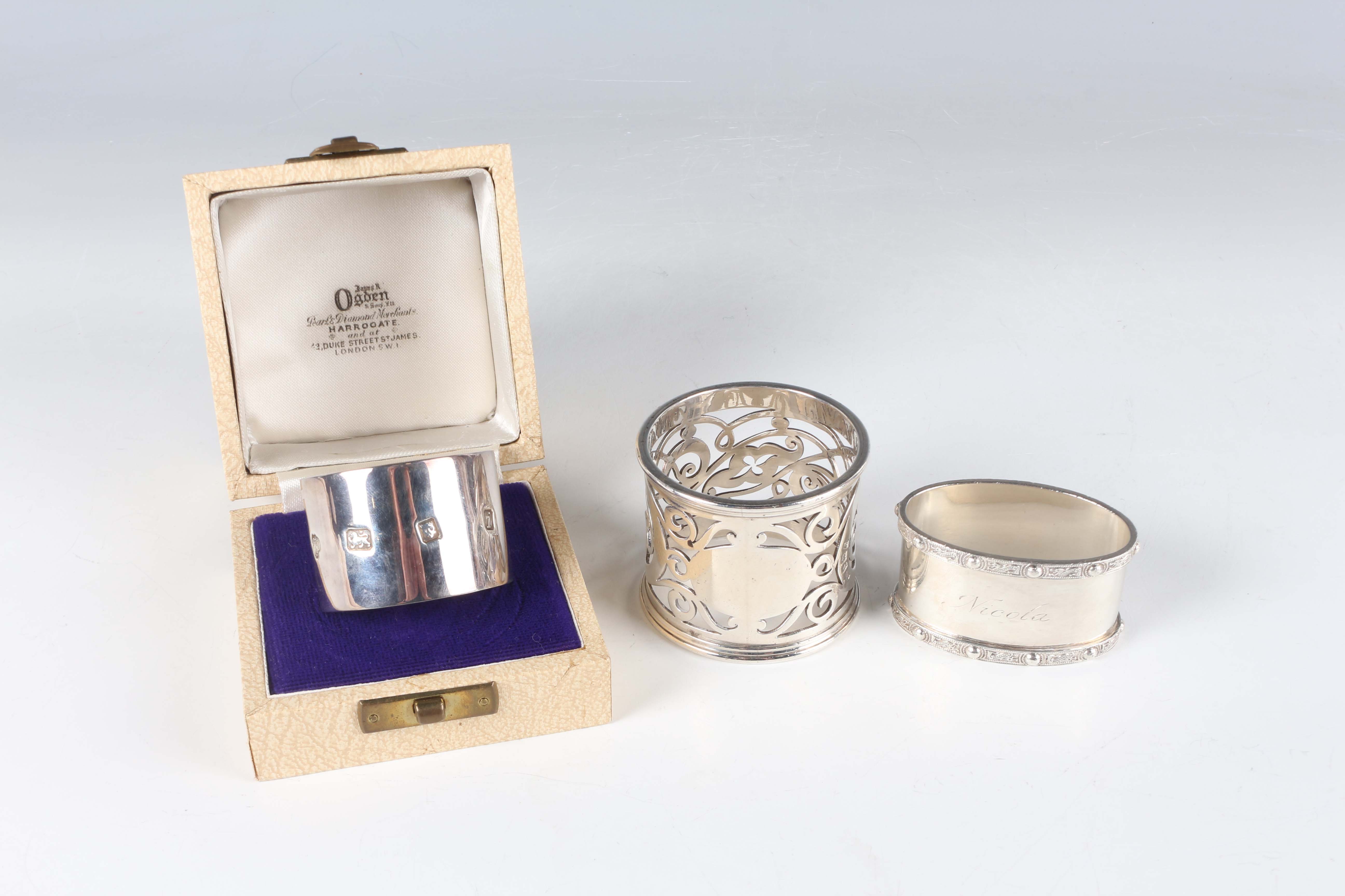 An Edwardian silver napkin ring with pierced scroll decoration, Birmingham 1904 by Fattorini & Sons Ltd, and two other silver napkin rings, Birmingham 1963 and London 1964, total weight 179g.