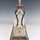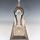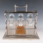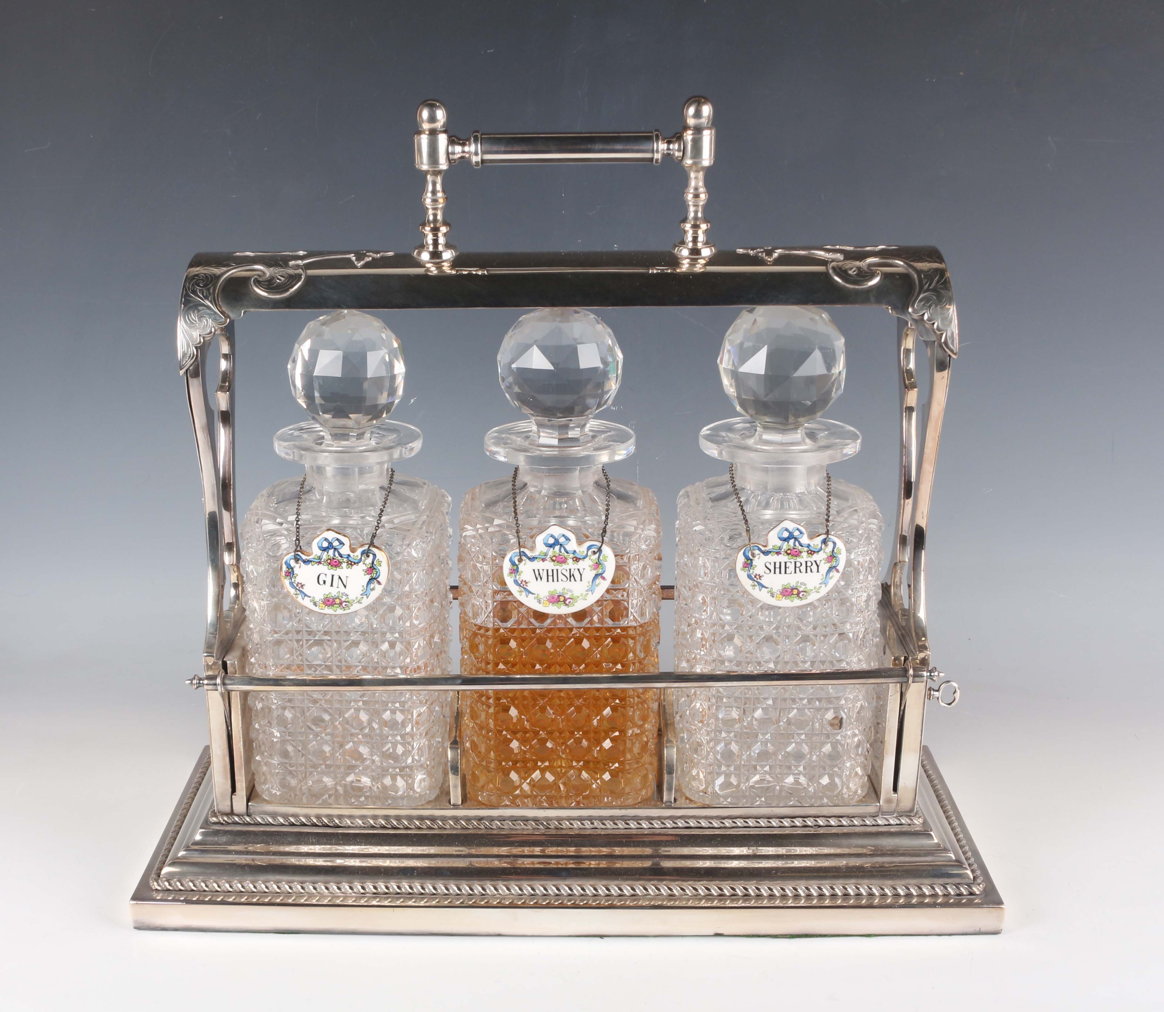 A late Victorian plated three-bottle tantalus, the angular handle flanked by strapwork decoration above a locking folding bar front, on a rectangular stepped and ropetwist base, length 42cm, height 39cm, fitted with three square cut glass decanters and stoppers and three Crown Staffordshire bone china decanter labels, comprising 'Sherry', 'Whisky' and 'Gin' (minor chips to one stopper).