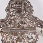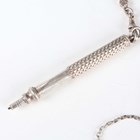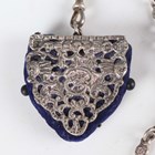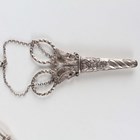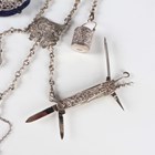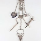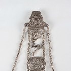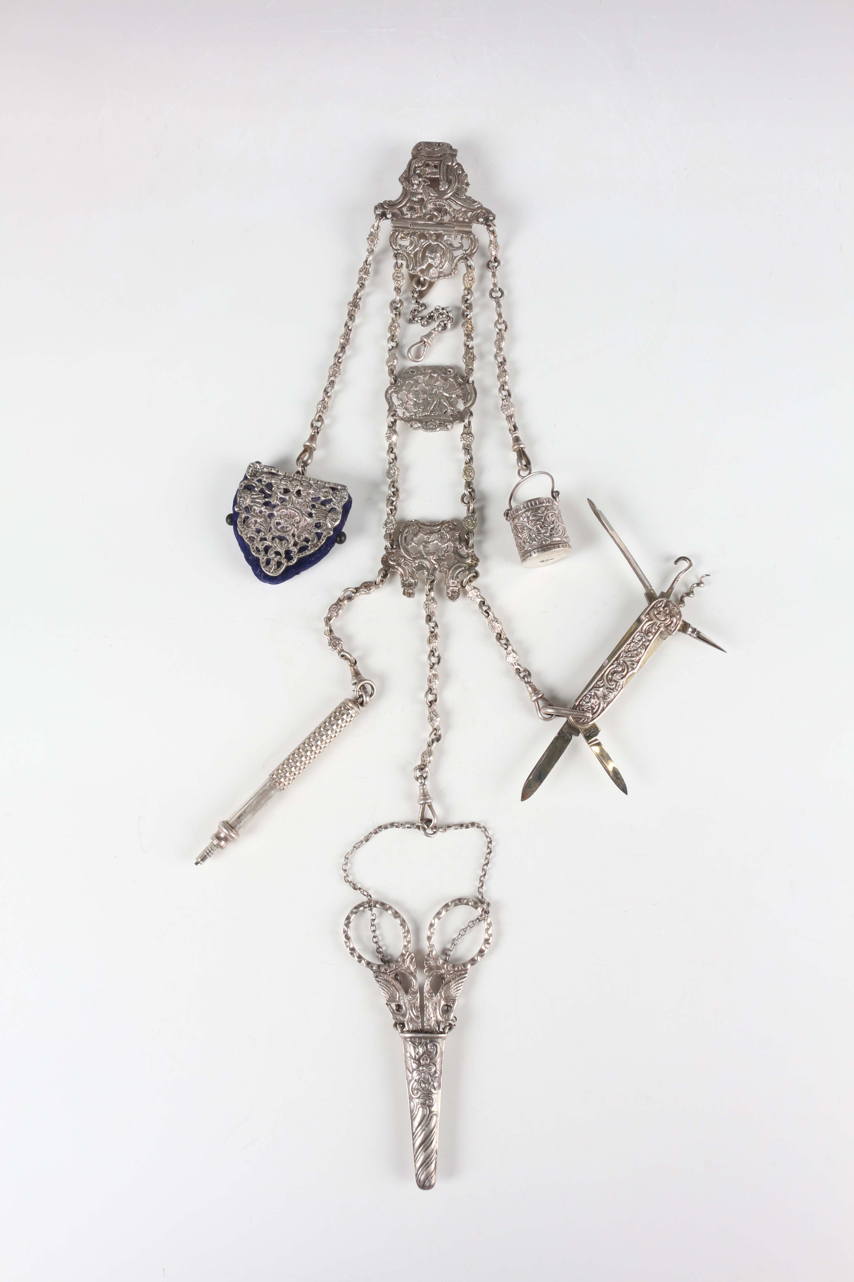A late Victorian silver châtelaine, the clip cast and pierced with figures, putti and scrolls, hung with six chains, fitted with a pin cushion, pocket knife with various folding implements and a scissors case and scissors, London 1895 and 1896 by Samuel Jacob, also fitted with a thimble case, Chester 1887 by Nathan & Hayes, a plated thimble and a plated propelling pencil by Sampson Mordan & Co, total weight excluding thimble 200g, total length 44.5cm.