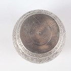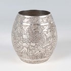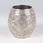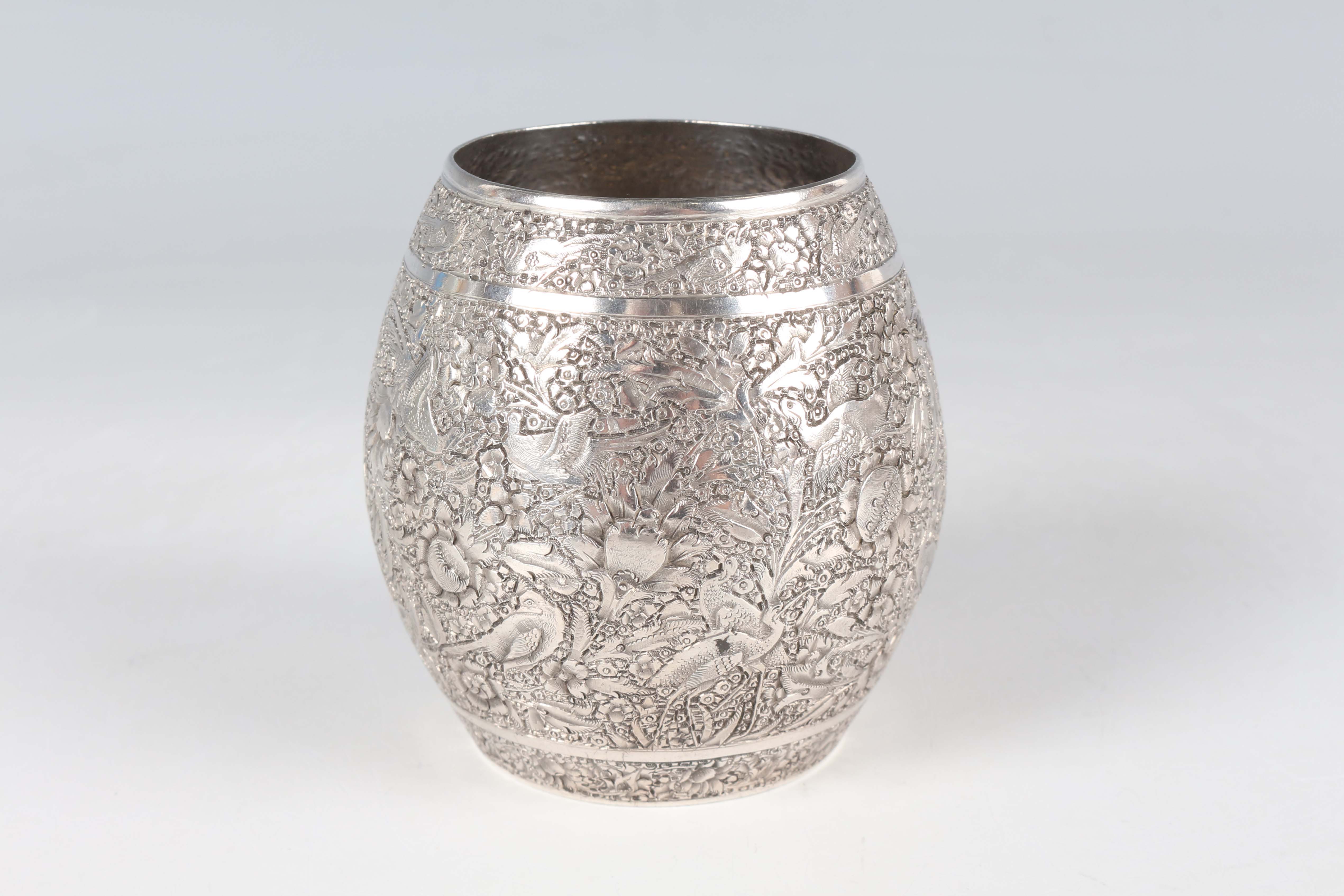 A Middle Eastern silver pot of swollen cylindrical form, finely chased with a dense design of birds and flowers, weight 99.3g, height 7cm.