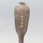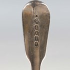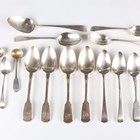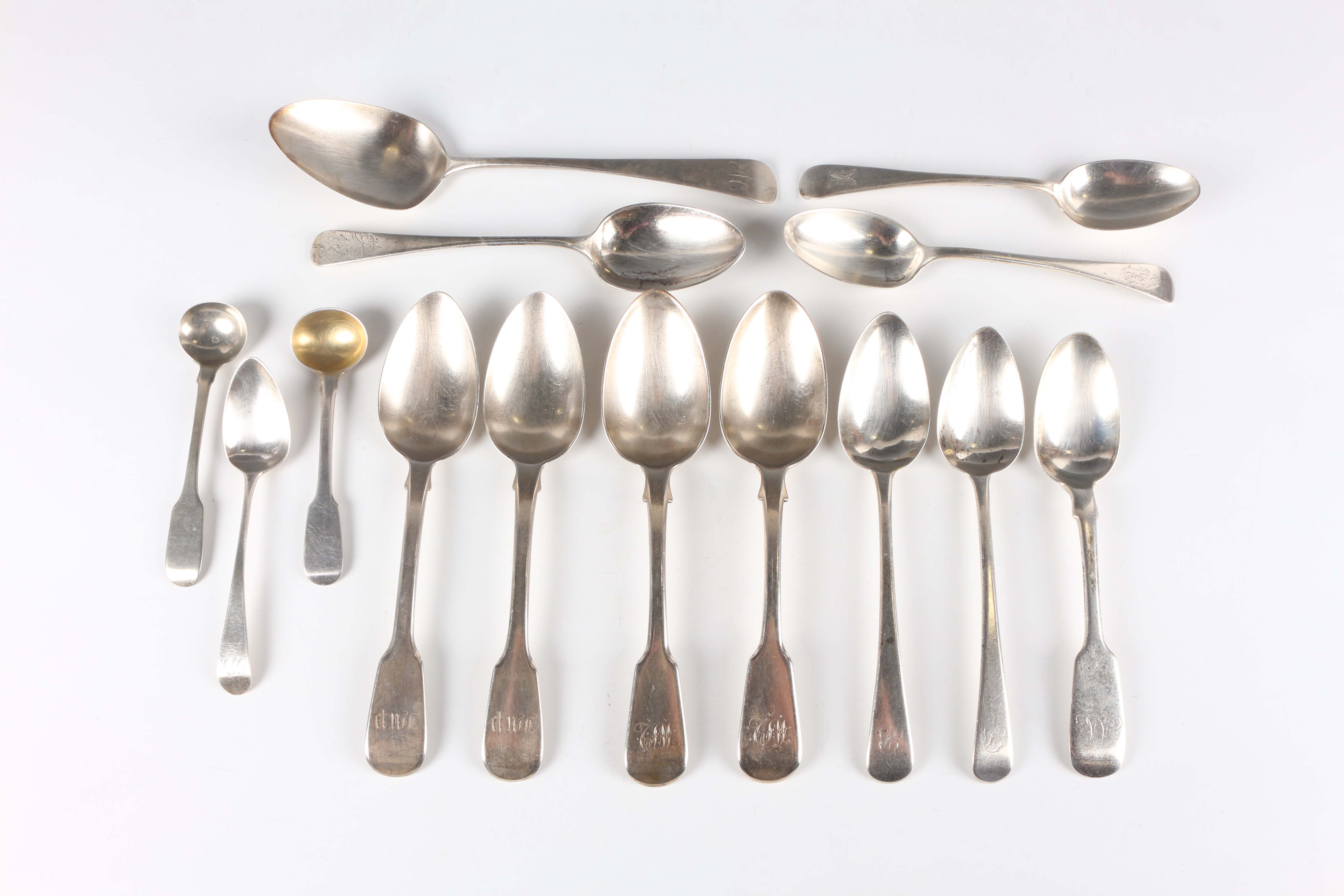 A Victorian Scottish silver Fiddle pattern dessert spoon, Edinburgh 1847 by James & Walter Marshall, a matched set of four silver Fiddle pattern dessert spoons, London 1825 by John, Henry & Charles Lias and John William Blake, two silver Fiddle pattern condiment spoons and a small group of silver Old English pattern spoons, including two dessert spoons, London 1789 by Thomas Wallis II, total weight 504.5g.