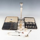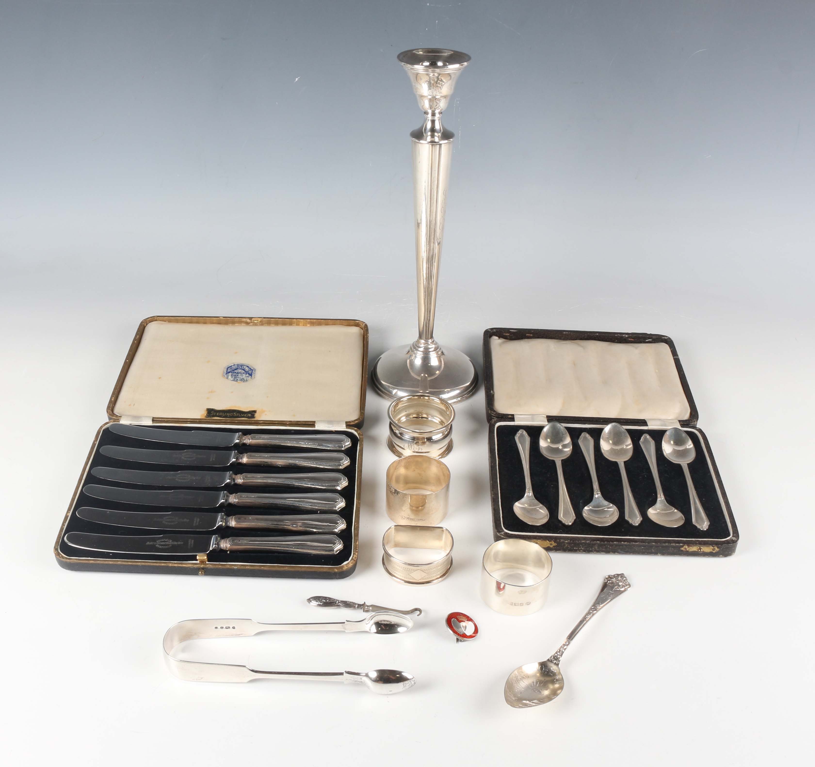 A group of silver, including a pair of Fiddle pattern sugar tongs, London 1844 by Joseph & Alert Savory, four napkin rings, an American sterling dessert spoon, the bowl engraved with a sunrise and title 'Aurora', by Wendell Manufacturing Co, Chicago, a set of six teaspoons, cased, and a candlestick, height 26cm, weighable items 214g.