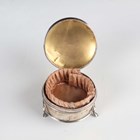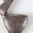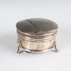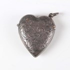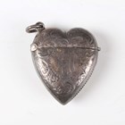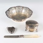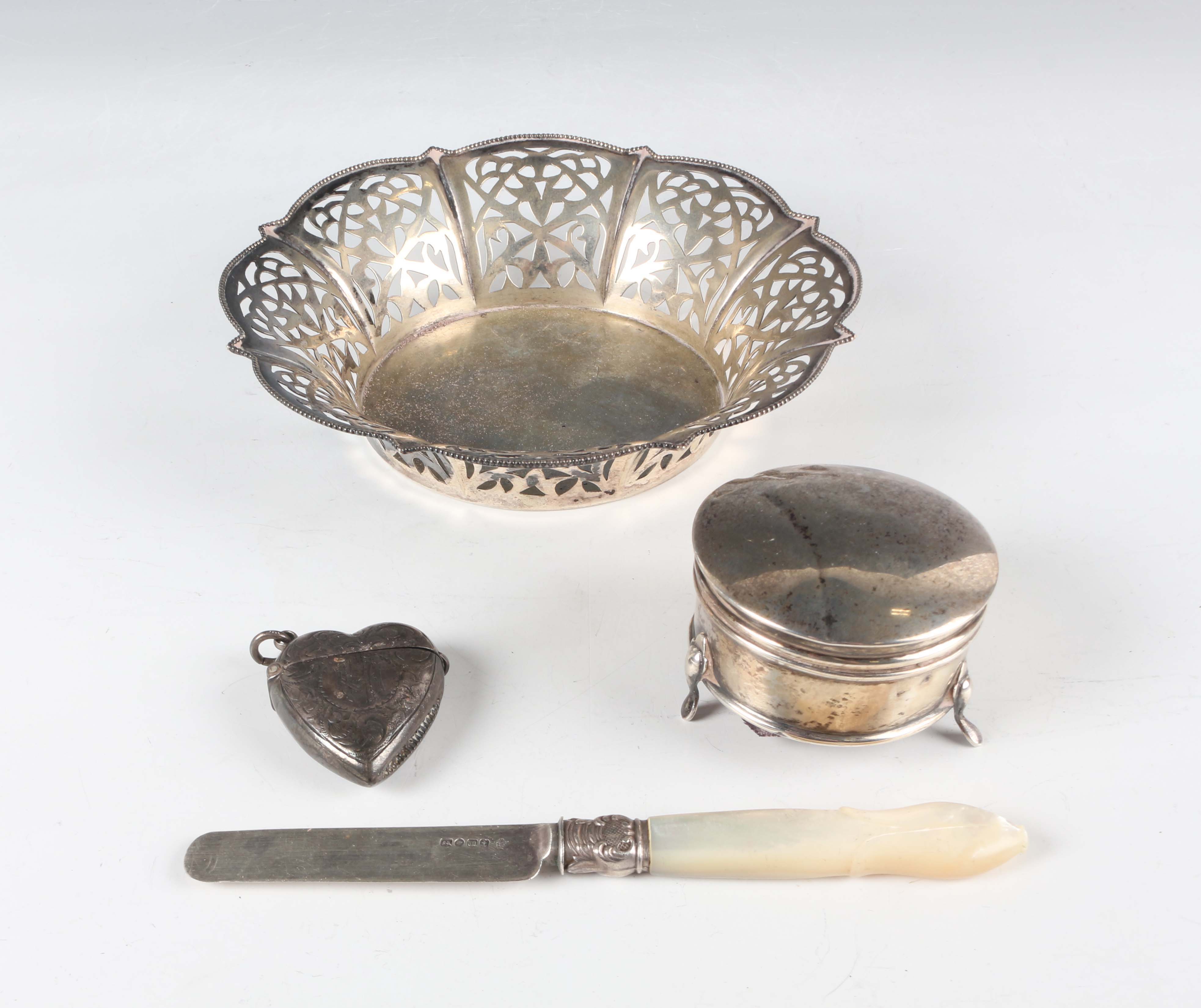 A late Victorian silver heart shaped vesta case, monogram and scroll engraved, Birmingham 1897 by Rolason Brothers, length 4cm, and a silver circular trinket box on scroll legs, Birmingham 1912, total weight 43.8g, together with a German .800 silver circular bowl with lobed and pierced sides beneath a beaded rim, by Adolf Mogler, weight 98.1g, diameter 15.2cm, and a silver bladed mother-of-pearl handled knife.