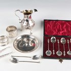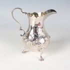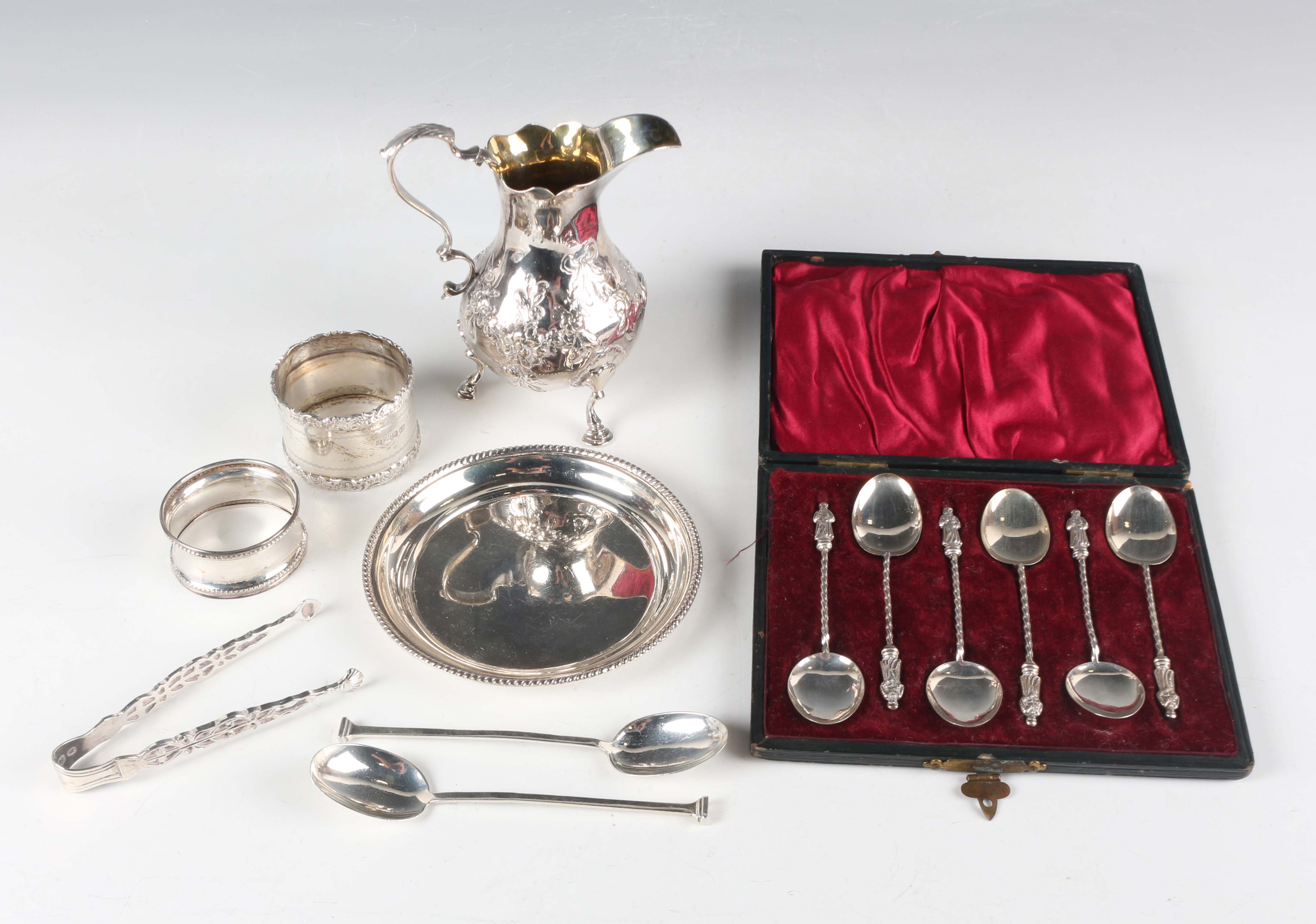 A George III silver baluster cream jug with scroll handle, chased with floral garlands, raised on scroll legs terminating in hoof feet, London 1762 by Walter Brind, height 10.5cm, and a small group of other silver, including an Irish circular pin dish with beaded rim, Dublin 1970 by Royal Irish Silver Co, diameter 10.4cm, a set of six apostle coffee spoons, cased, and a pair of sugar tongs, London 1894, total weight 271.6g.