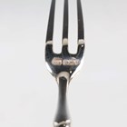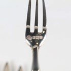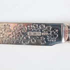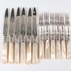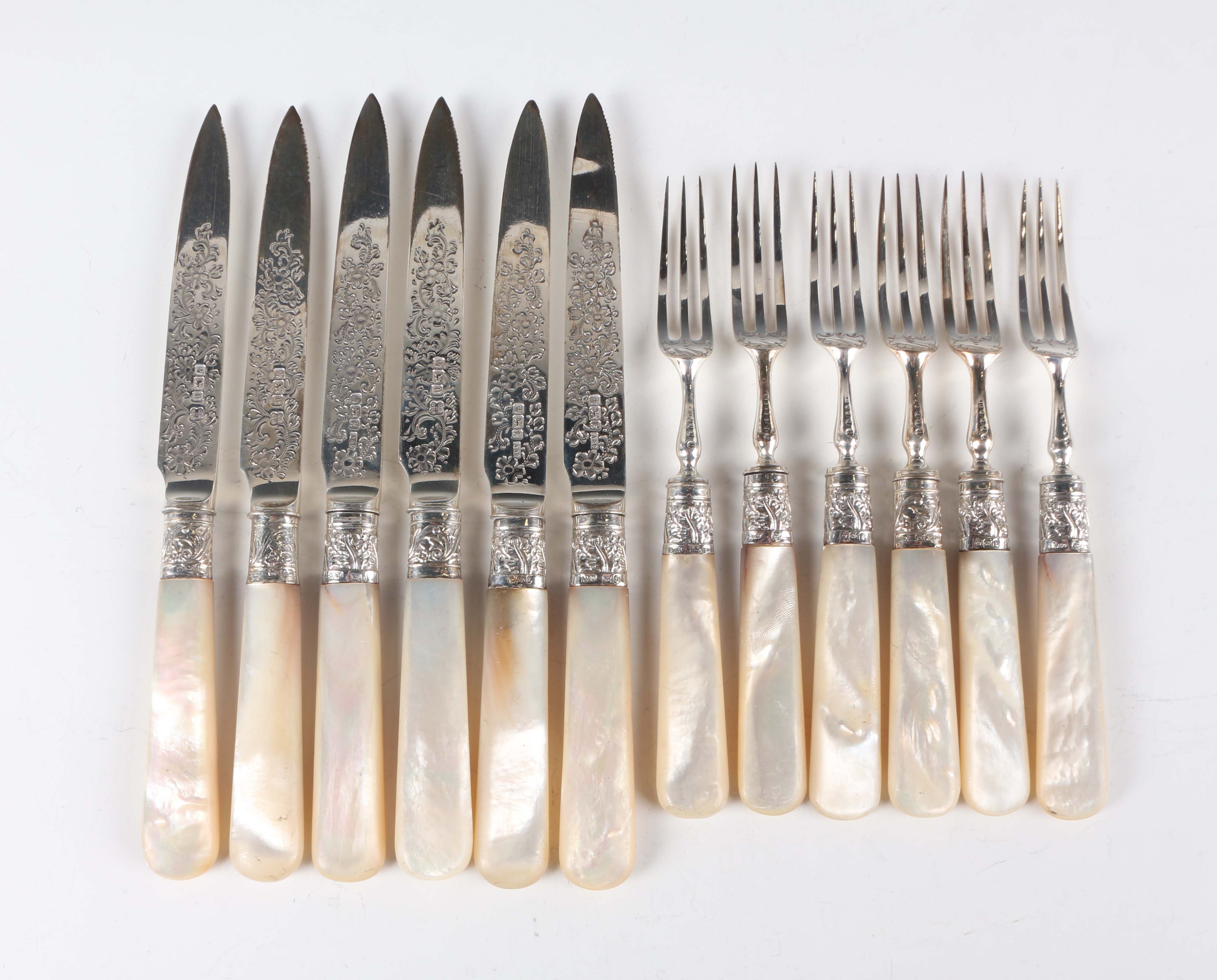 A late Victorian and later matched set of six silver and mother-of-pearl handled fruit knives and forks with floral engraved decoration, Sheffield 1899, 1901, 1902 and 1912 by Allen & Darwin and Martin, Hall & Co, total weight 385.9g.