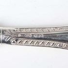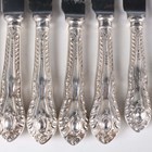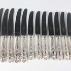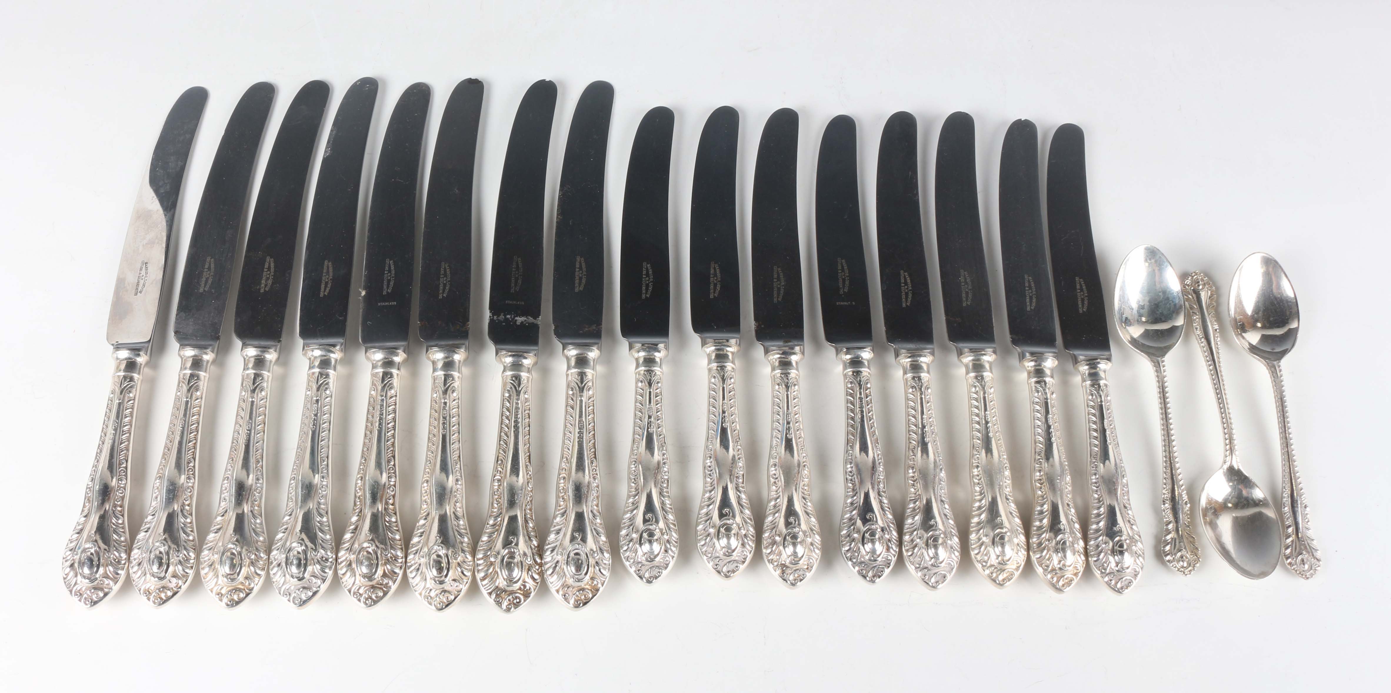 An Elizabeth II part canteen of silver cutlery with scroll and gadrooned handles, comprising eight tableknives and eight dessert knives, all with steel blades, and three teaspoons, Sheffield 1967, 1969, 1971 and 1972 by Gee & Holmes, weight of teaspoons only 94.7g.