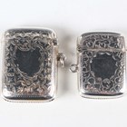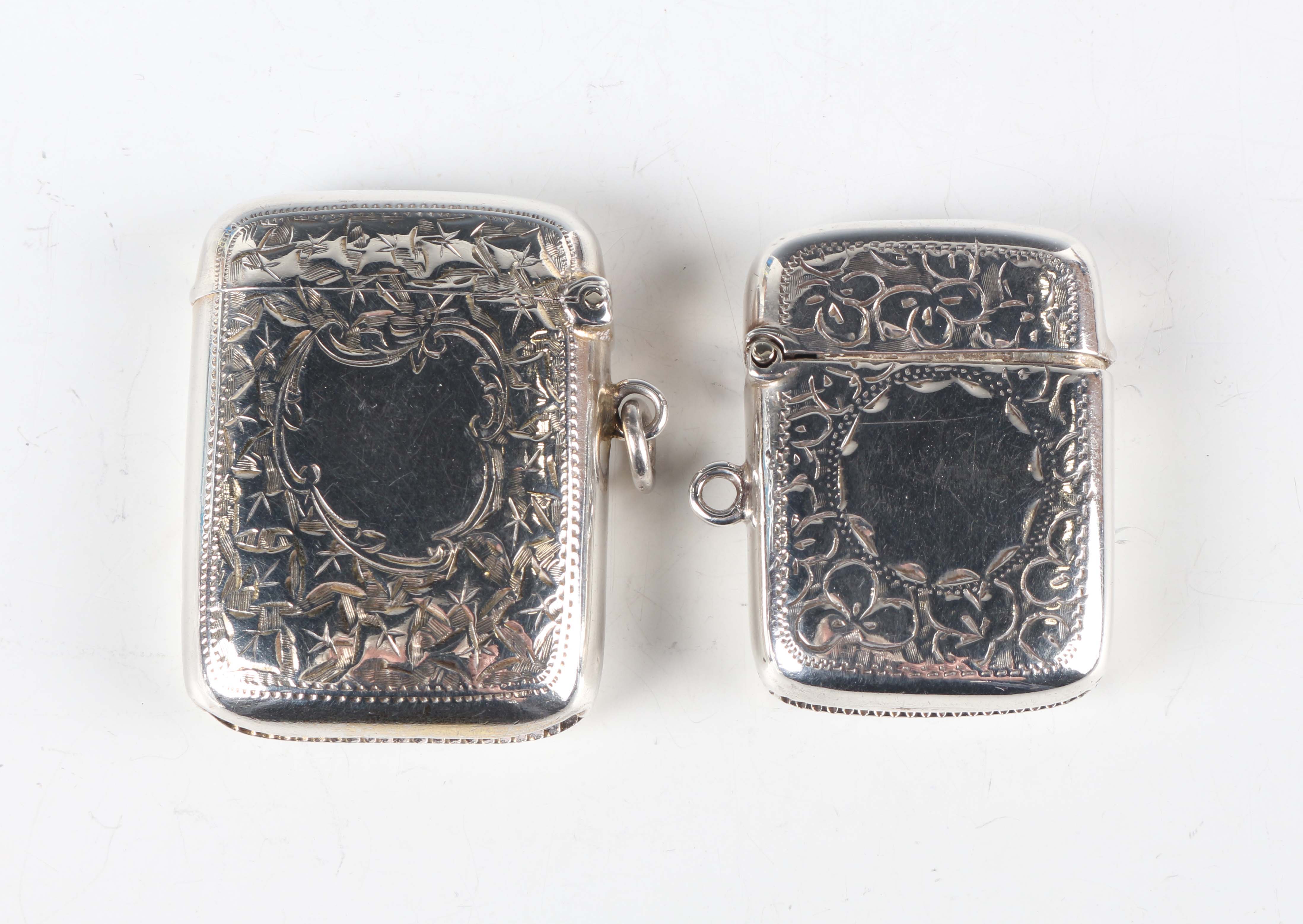An Edwardian silver vesta case with engraved ivy leaf decoration, Birmingham 1905 by Joseph Gloster, height 4.5cm, and another similar silver vesta case, Birmingham 1919, height 4cm, total weight 45.6g.
