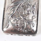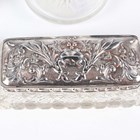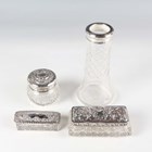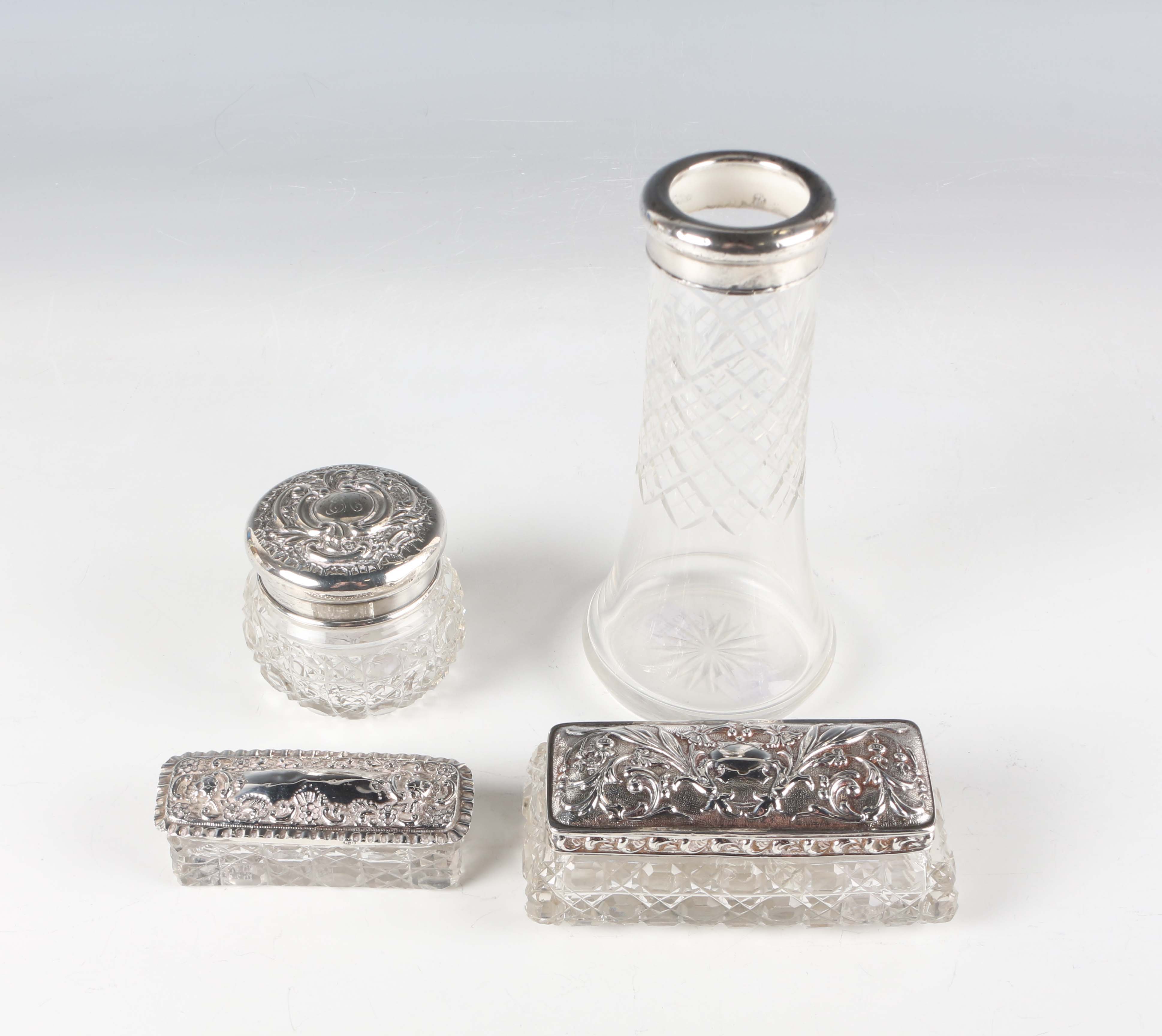 An Edwardian silver lidded rectangular cut glass dressing table box with foliate embossed decoration, Chester 1904 by Colen Hewer Cheshire, two other silver lidded cut glass dressing table jars, weight of three lids 45g, and a silver mounted cut glass posy vase, London 1924, height 15.5cm.