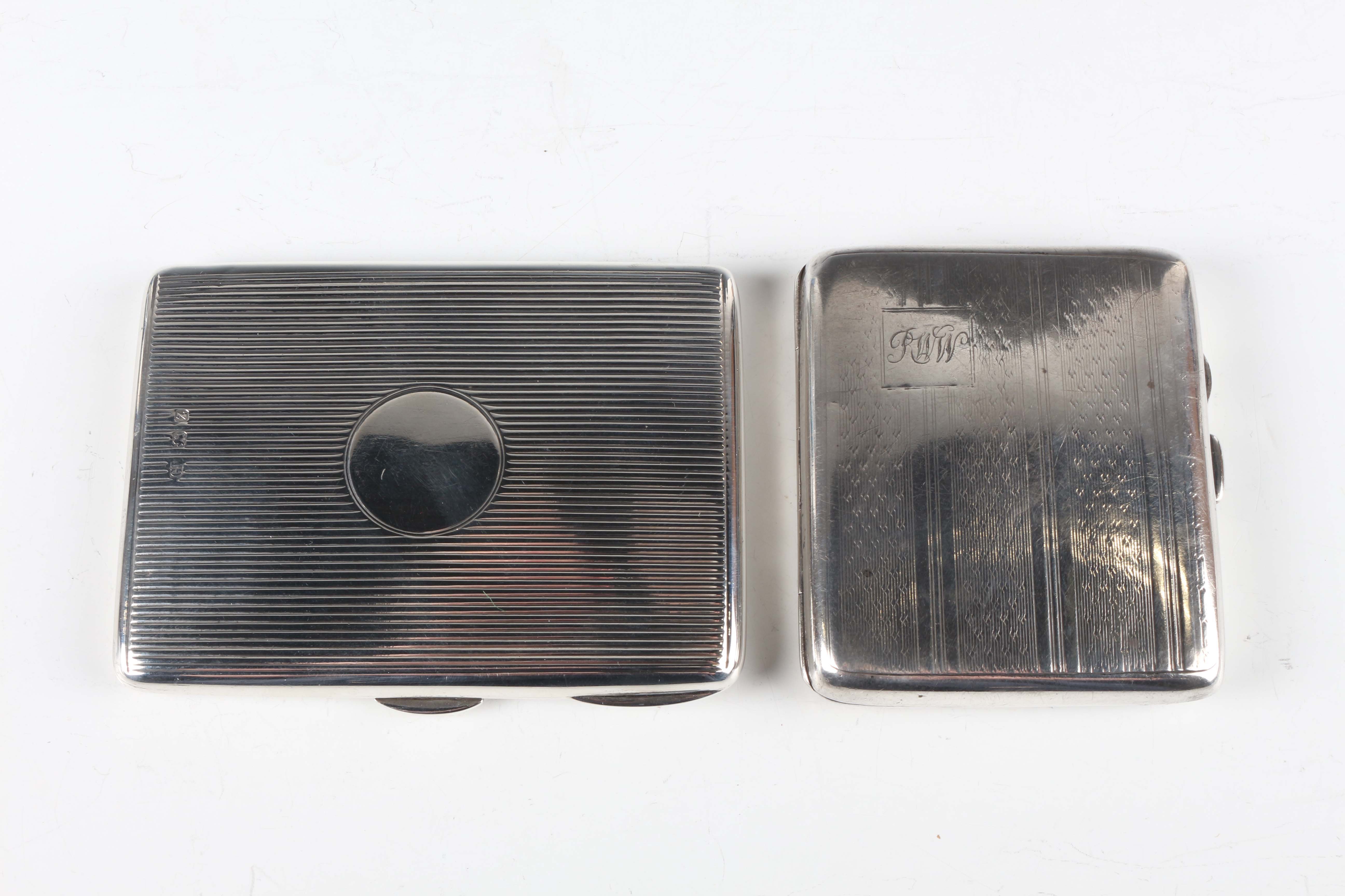 A late Victorian silver rectangular cigarette case with banded decoration, Birmingham 1899 by George Unite, length 10.2cm, cased, and another silver cigarette case with engine turned decoration, Birmingham 1927, length 7.7cm, total weight 177.3g.