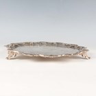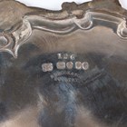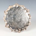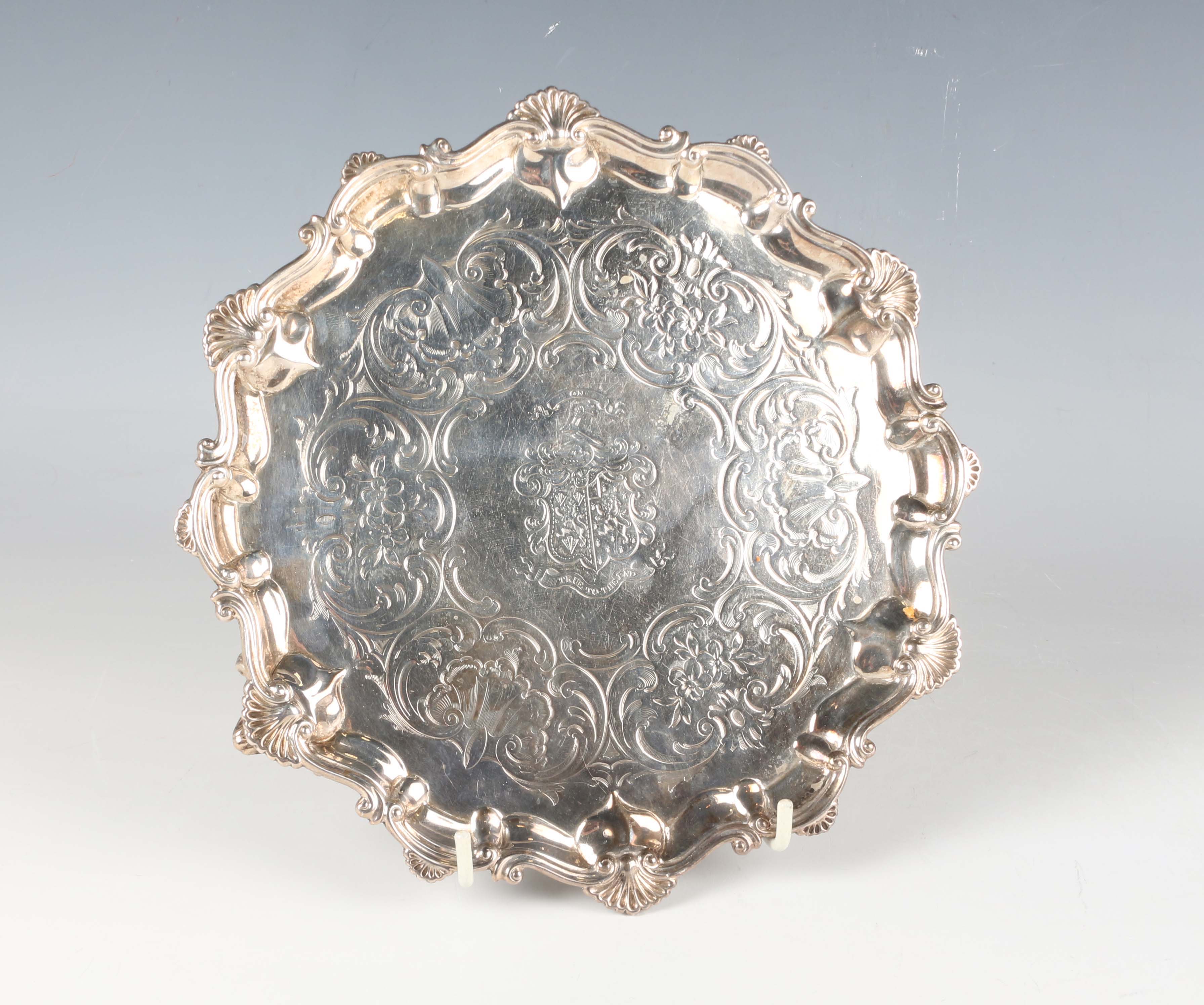 An early Victorian silver circular card salver, engraved with a coat of arms within a surround of floral and foliate scrolls, within a raised scallop shell and 'S' scroll rim, on scroll feet, London 1850 by Edward, John & William Barnard, weight 340g, diameter 21.5cm.