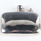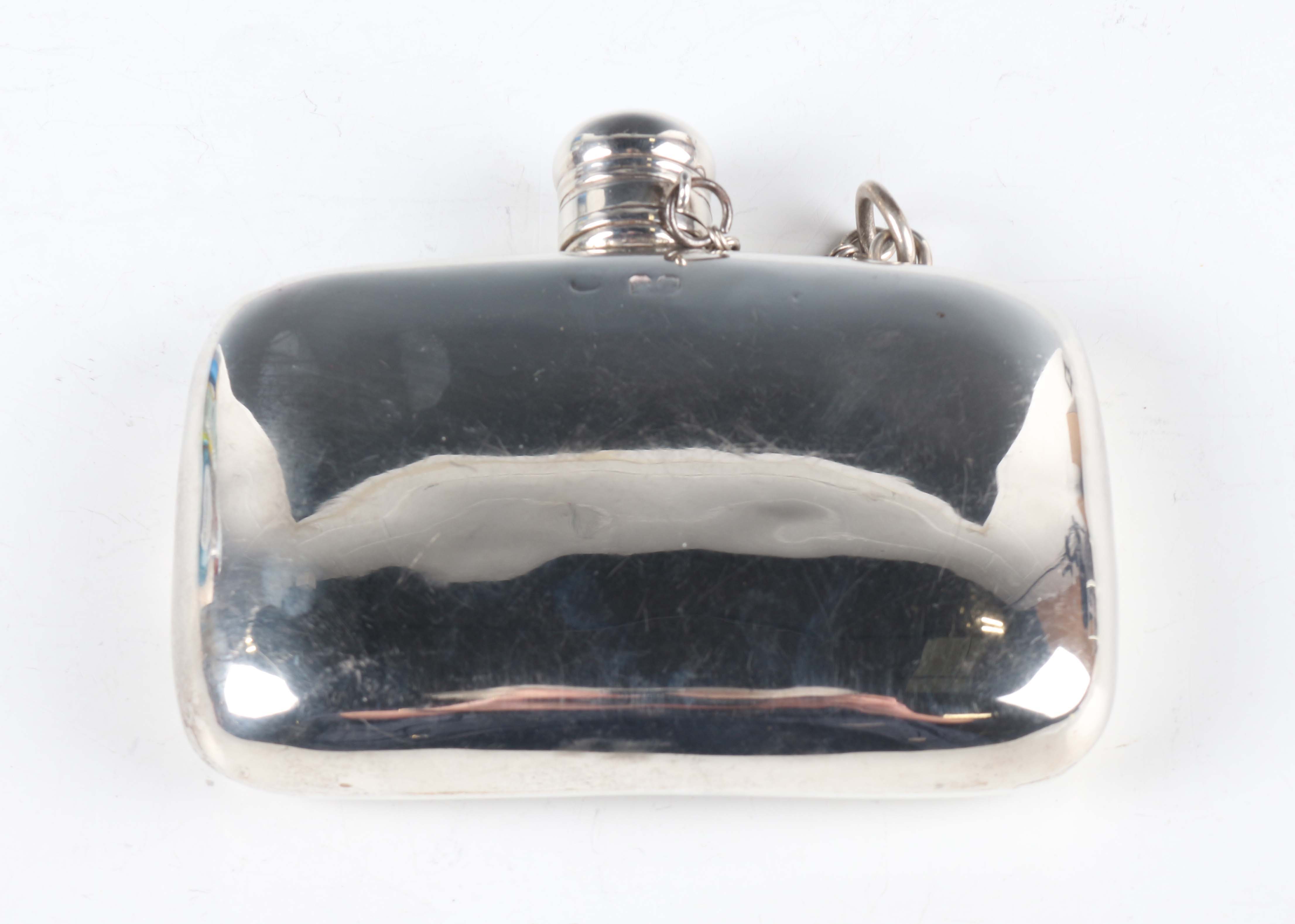 A Victorian silver curved rectangular hip flask, the screw lid with cork insert and fitted with a chain, London 1868, weight 109.2g, height 9cm, length 10.8cm.