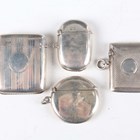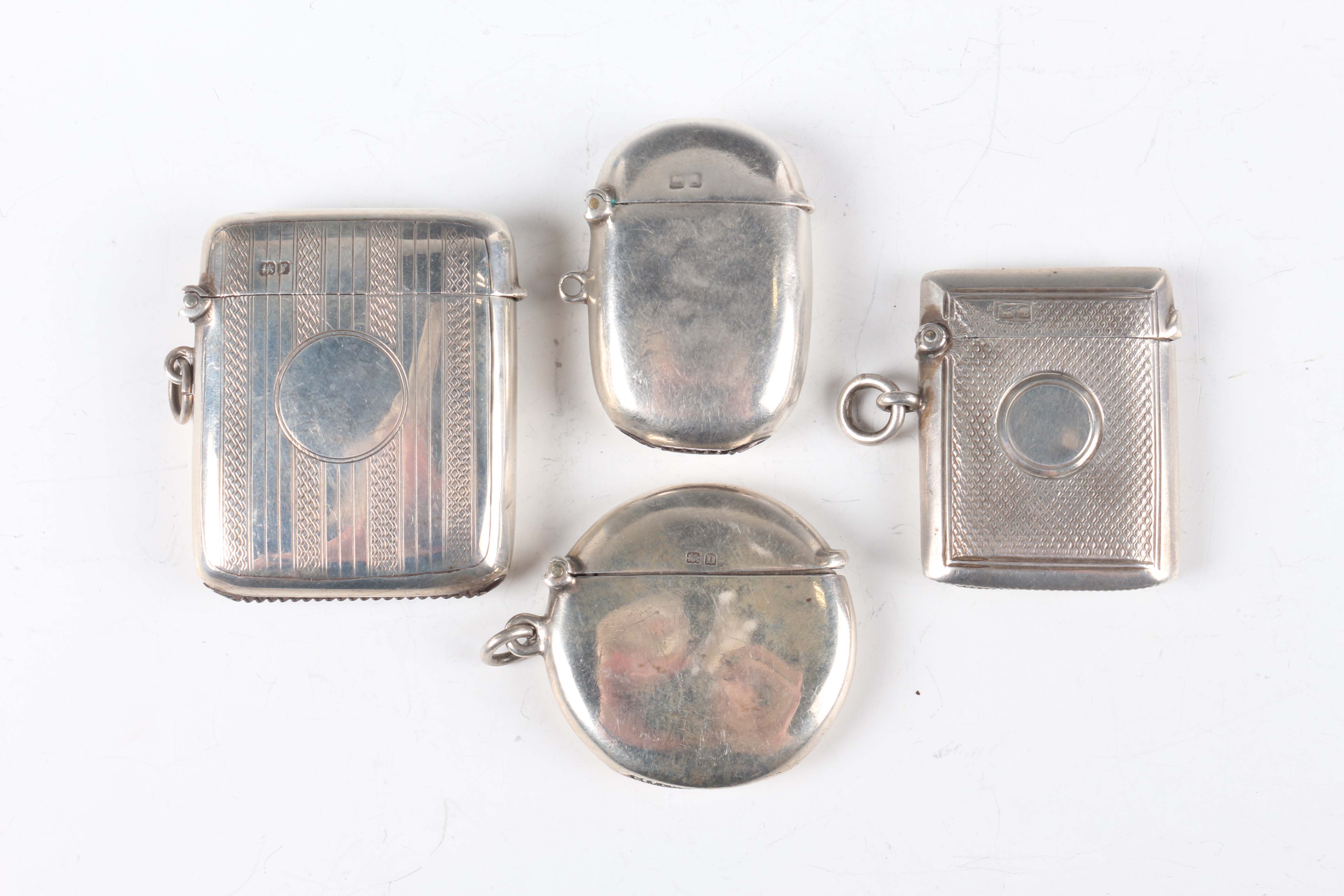 A George V silver circular vesta case, Birmingham 1912 by William Hutton & Sons Ltd, diameter 4cm, and three other silver vesta cases, various dates and makers, total weight 97.6g.