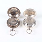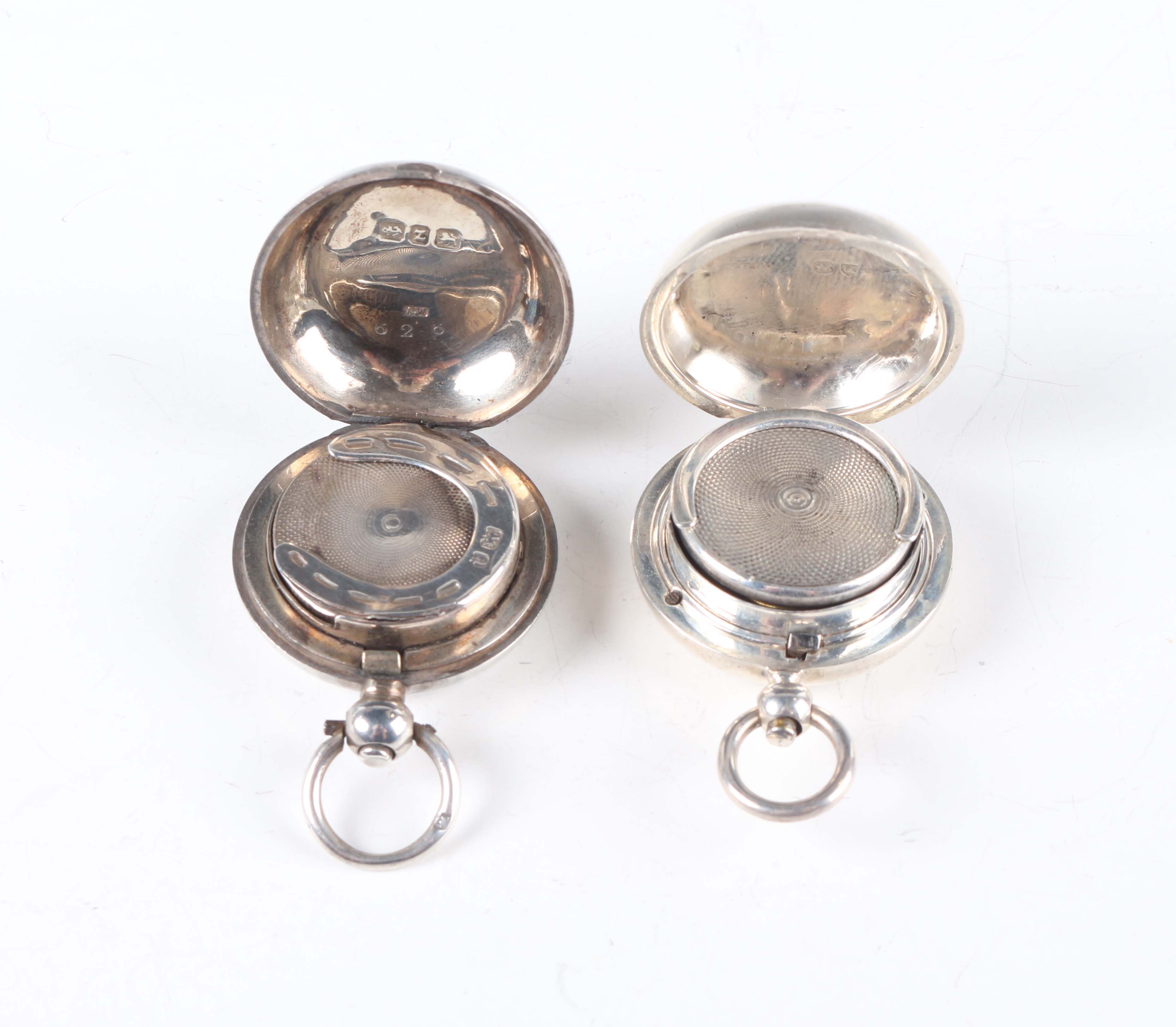 A late Victorian silver sovereign case, London 1887 by Army & Navy Cooperative Society Ltd, length 4.5cm, and another silver sovereign case with engraved decoration, the interior with a horseshoe sovereign dispenser, Birmingham 1899 by Alfred Wigley, length 4.7cm, total weight 39.2g.