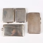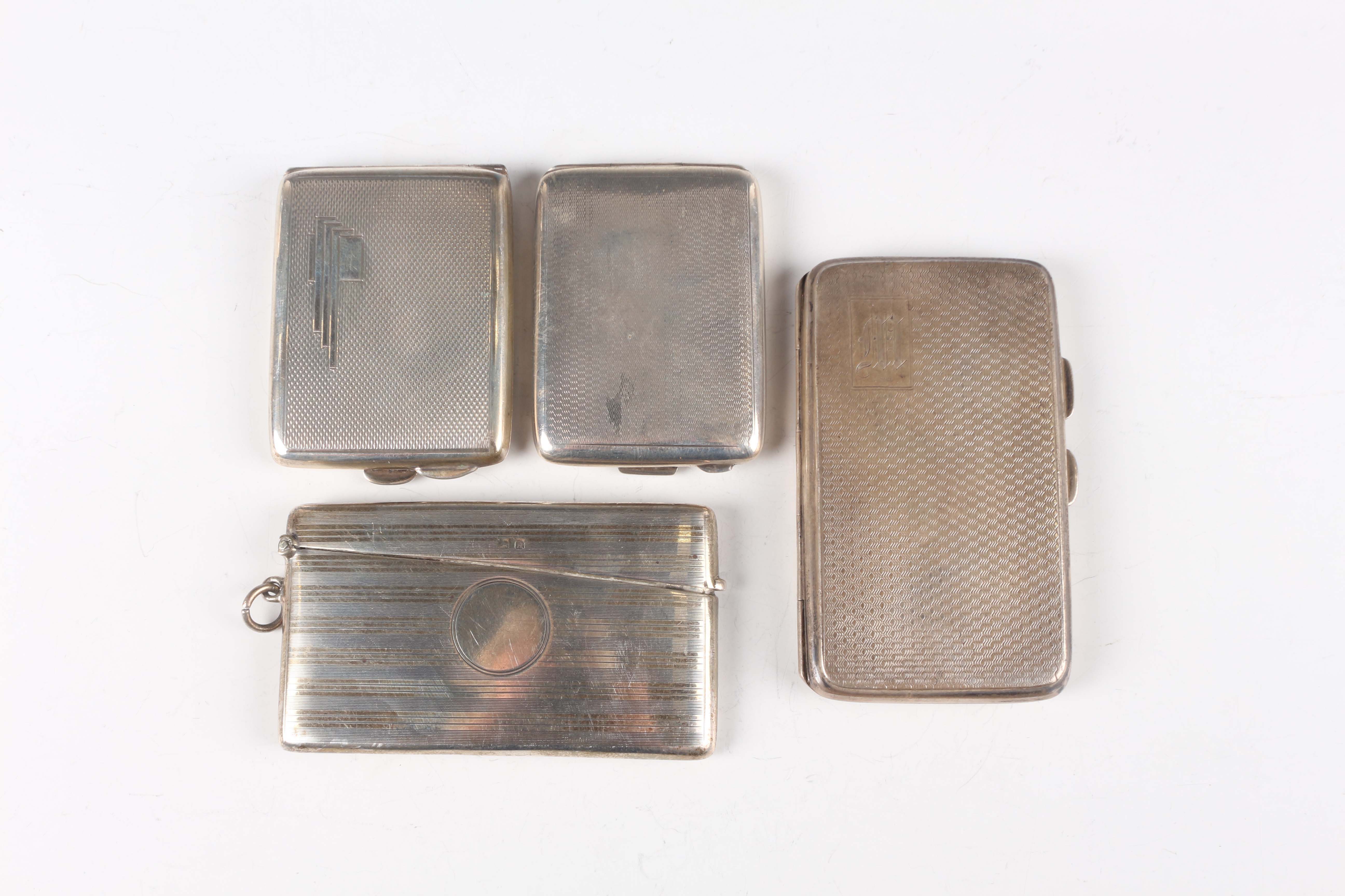 A George V silver rectangular cigarette case with engine turned decoration, Birmingham 1926, length 8.5cm, two silver match sleeve cases, Birmingham 1928 and 1936, and a silver curved rectangular card case with banded engine turned decoration, Birmingham 1925, total weight 180.2g.