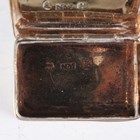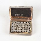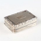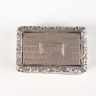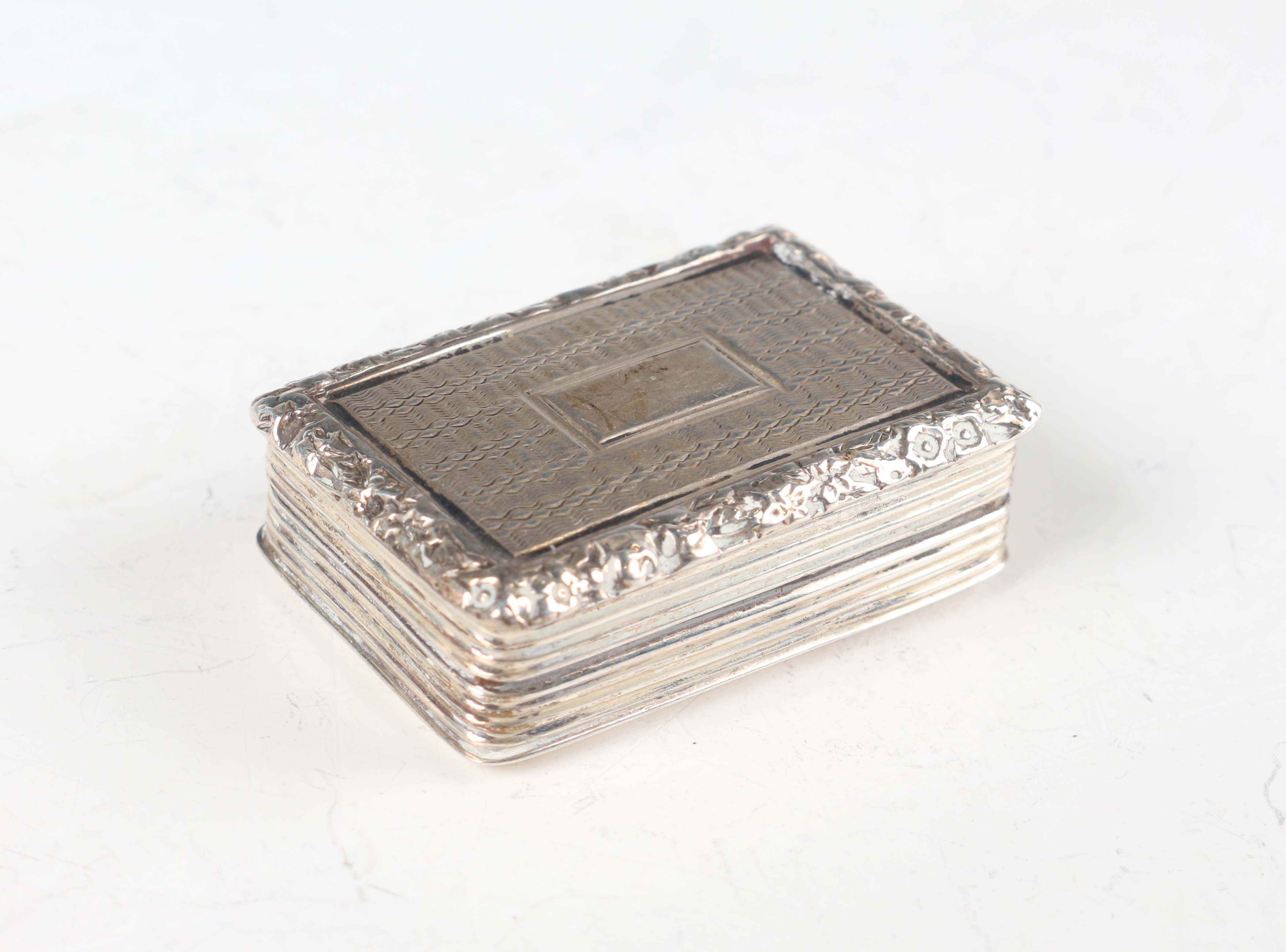 A George IV silver rectangular vinaigrette with engine turned decoration, the hinged lid with floral and scroll border, revealing a gilt interior with pierced and engraved hinged grille, Birmingham 1825 by Nathaniel Mills, weight 16.3g, length 3.5cm.